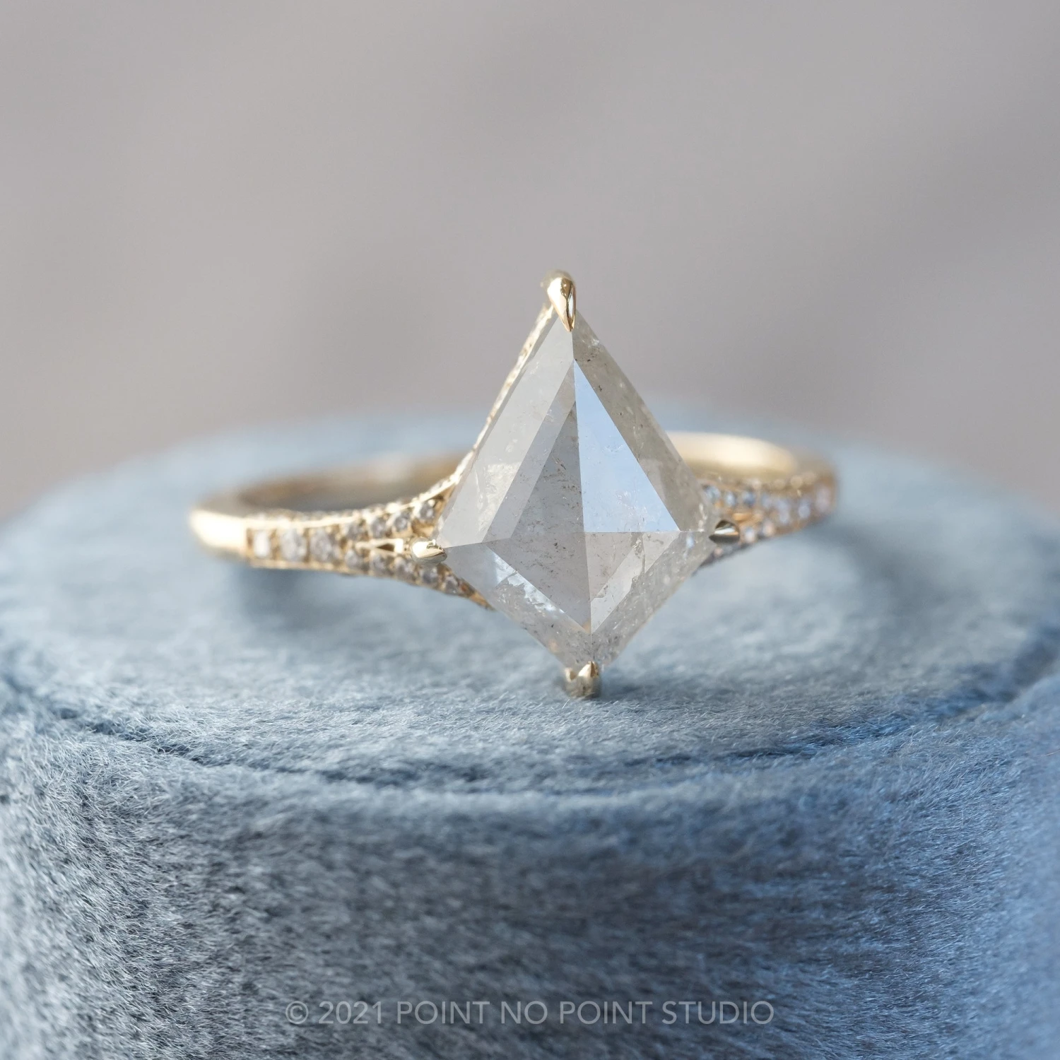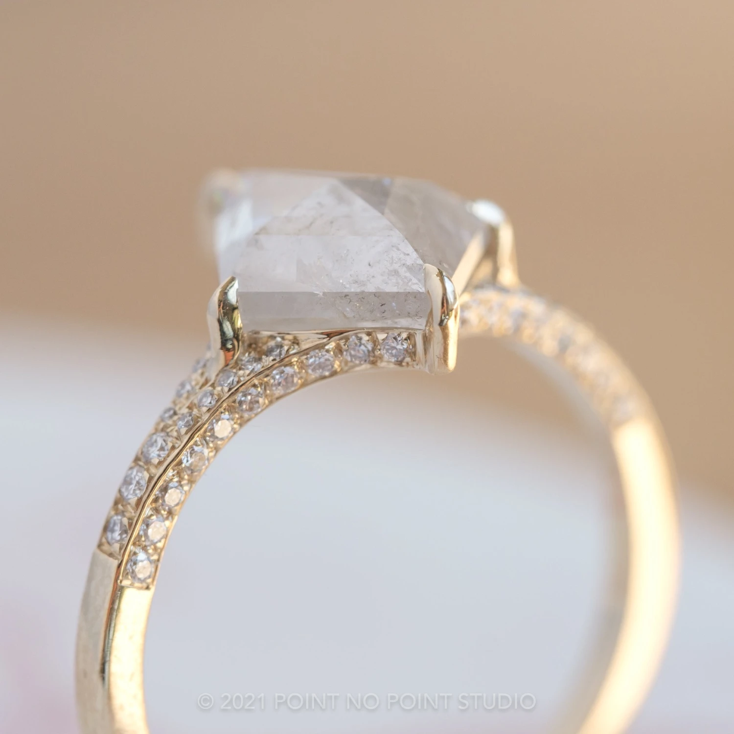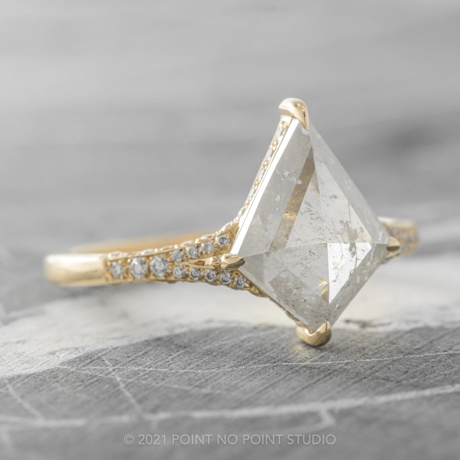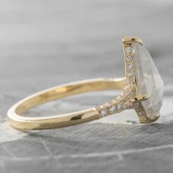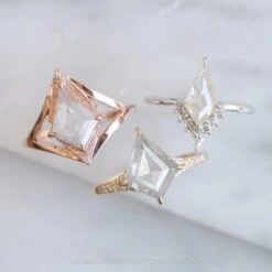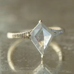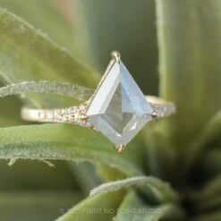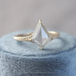 The ring features a striking hand cut 2.80 carat icy white kite rose cut diamond. This unique setting has diamonds micro pave set around setting and band to give it that extra sparkle!Â