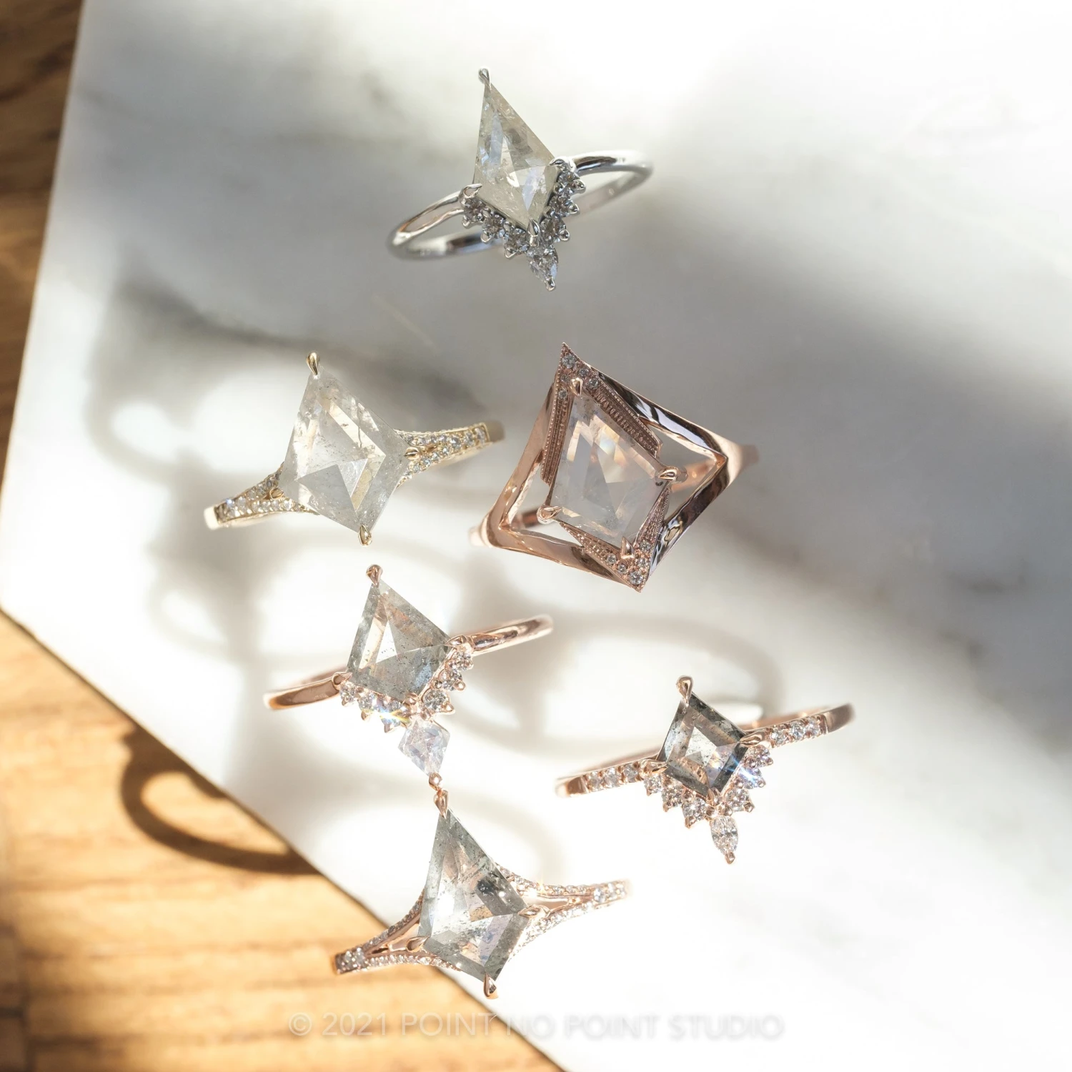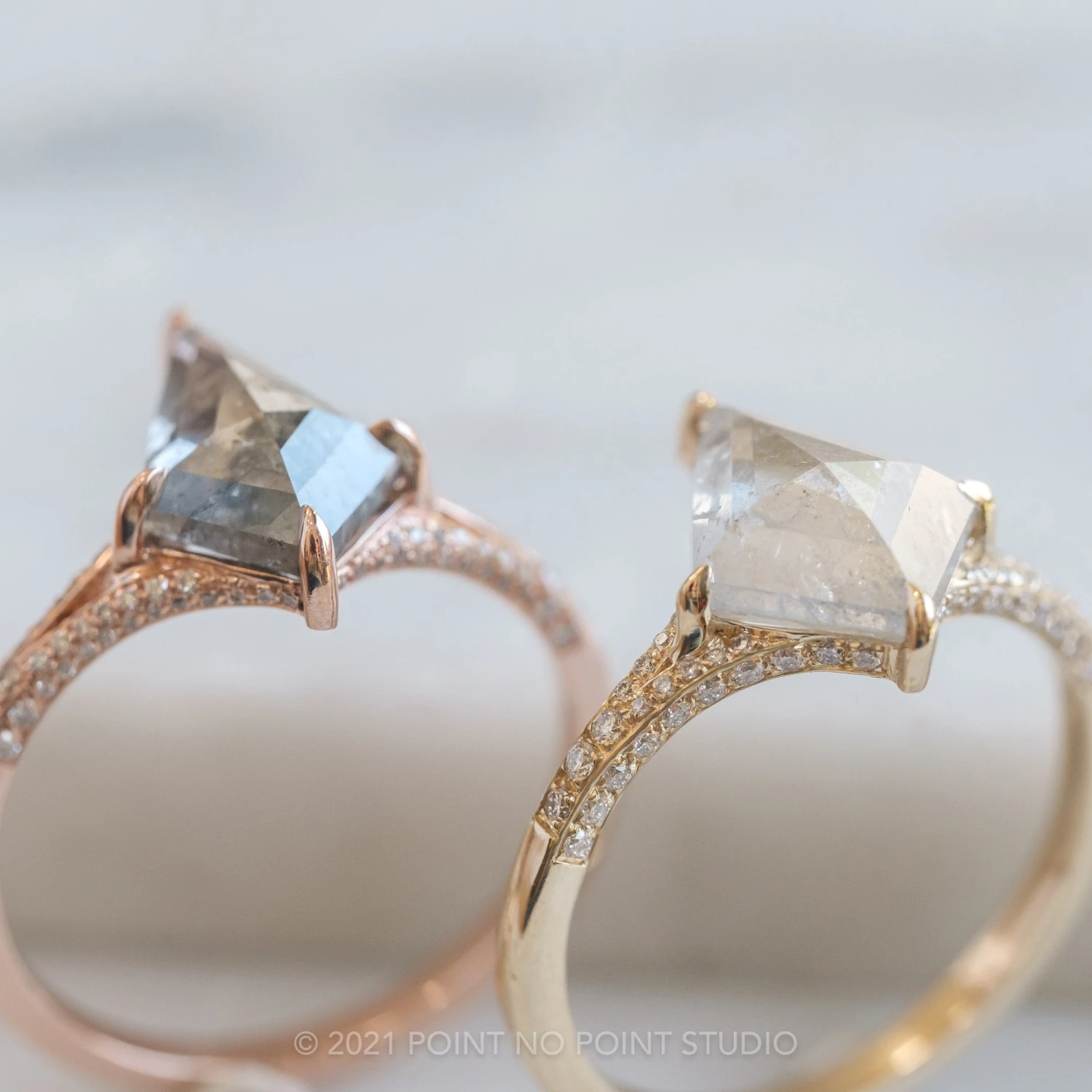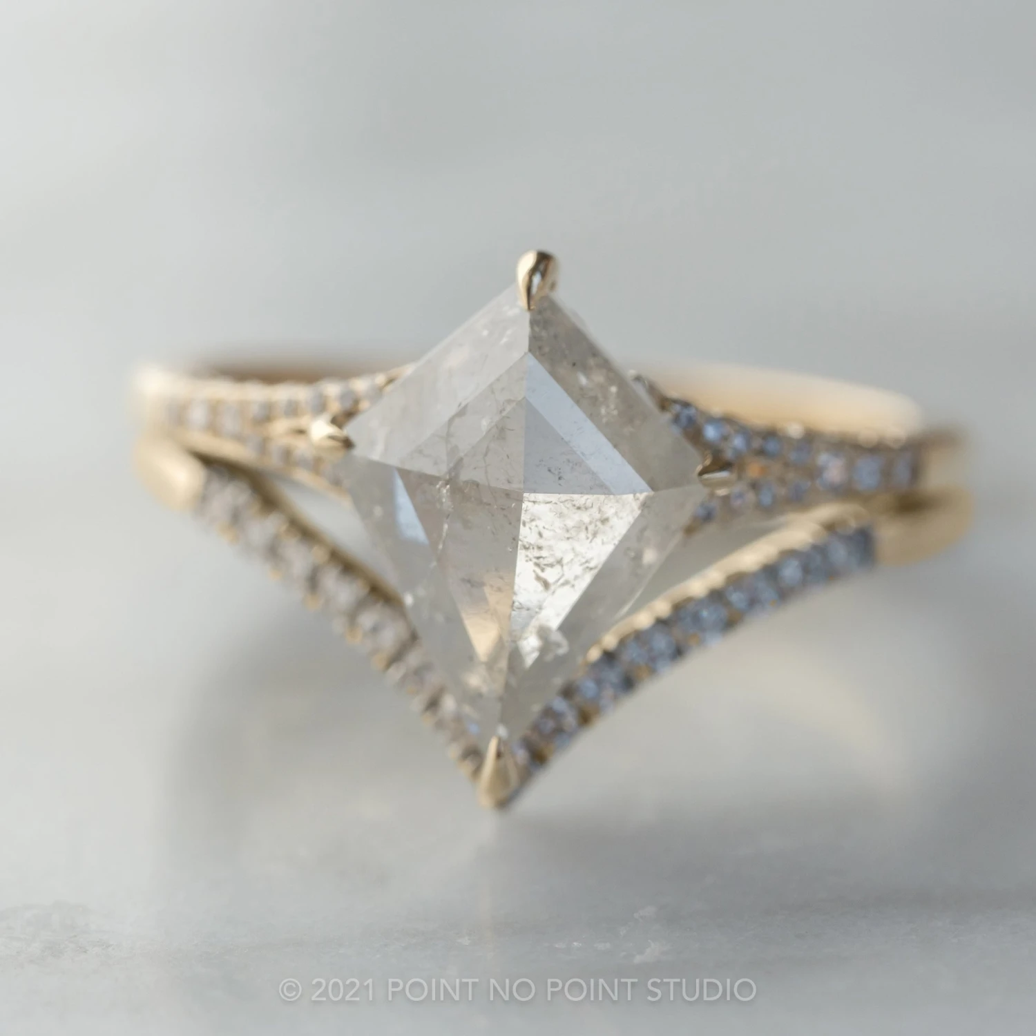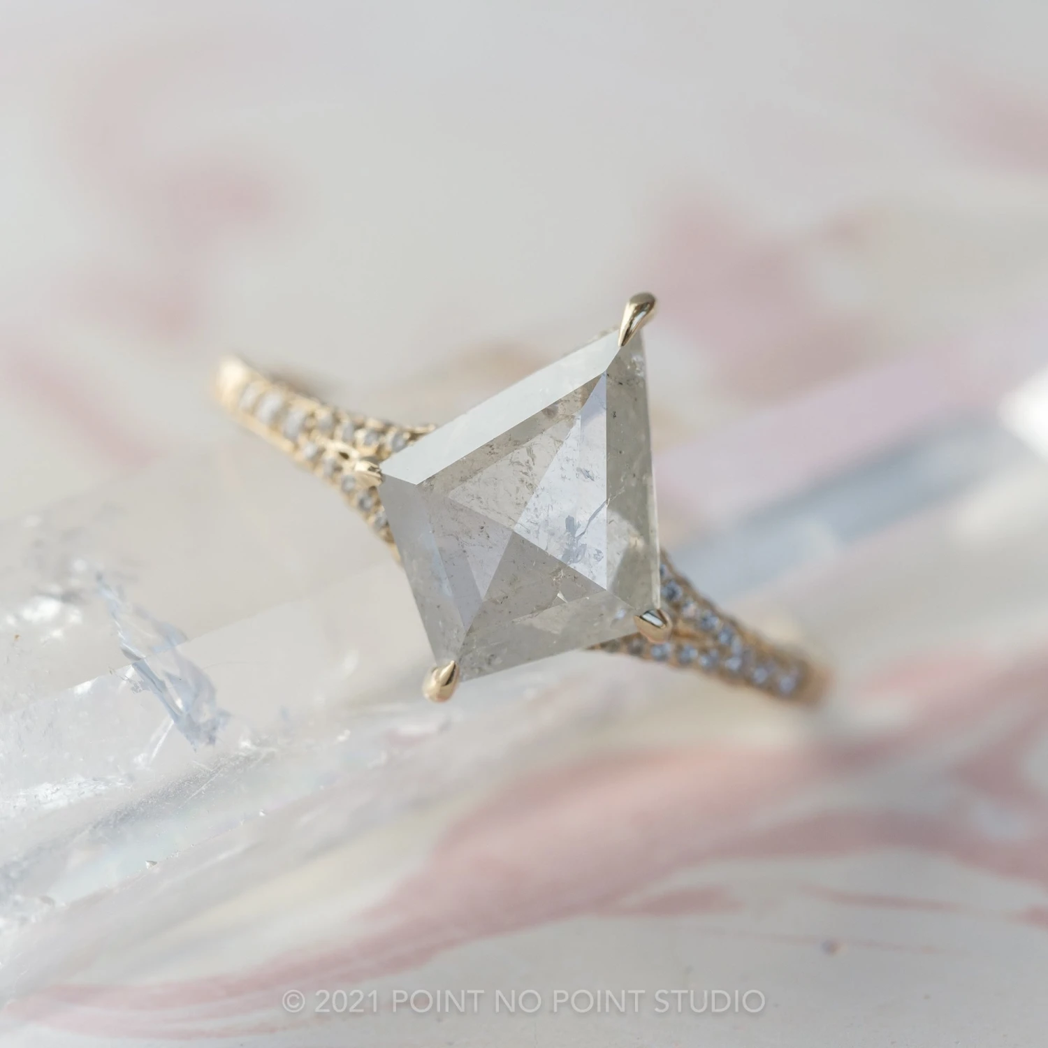 The ring features a striking hand cut 2.80 carat icy white kite rose cut diamond. This unique setting has diamonds micro pave set around setting and band to give it that extra sparkle!Â