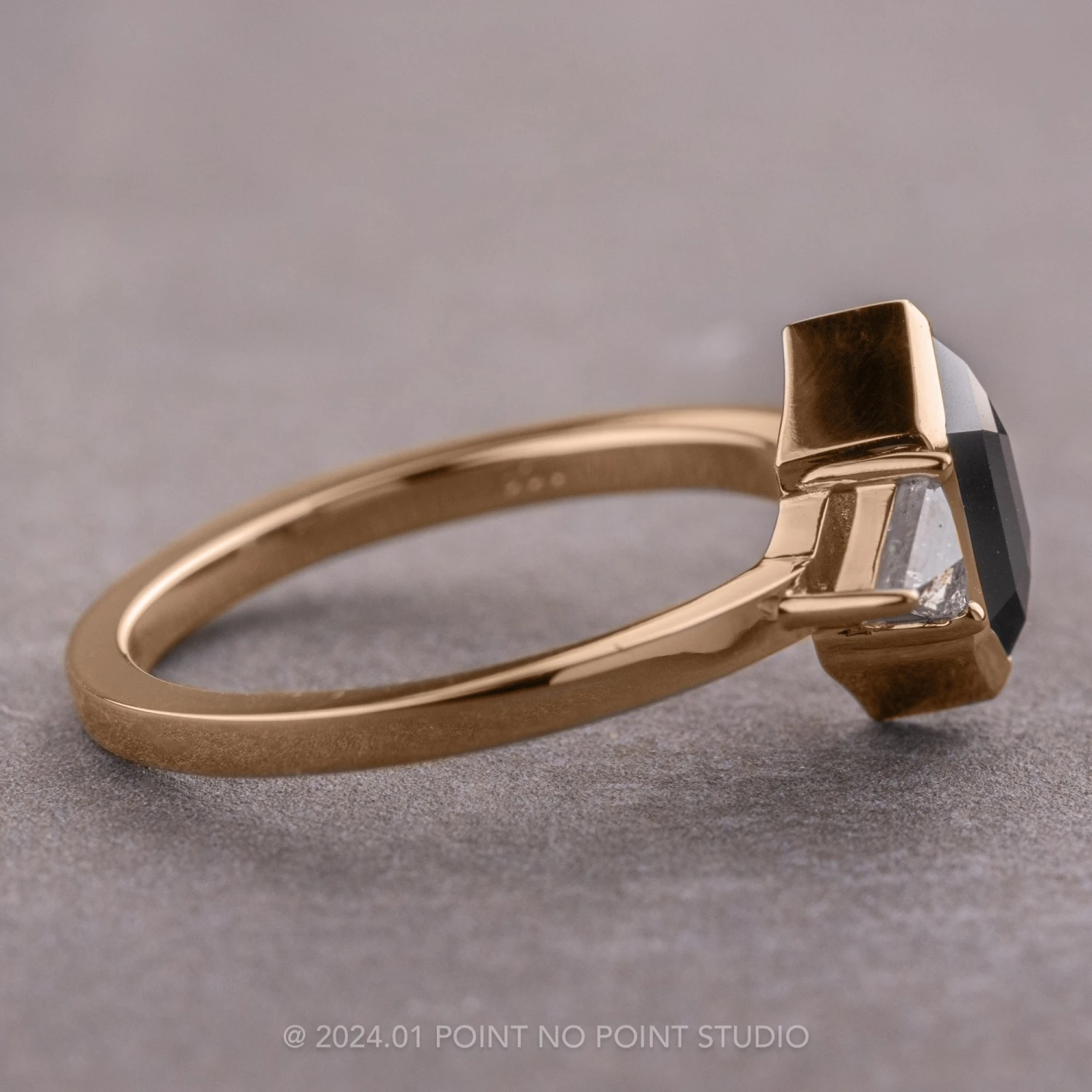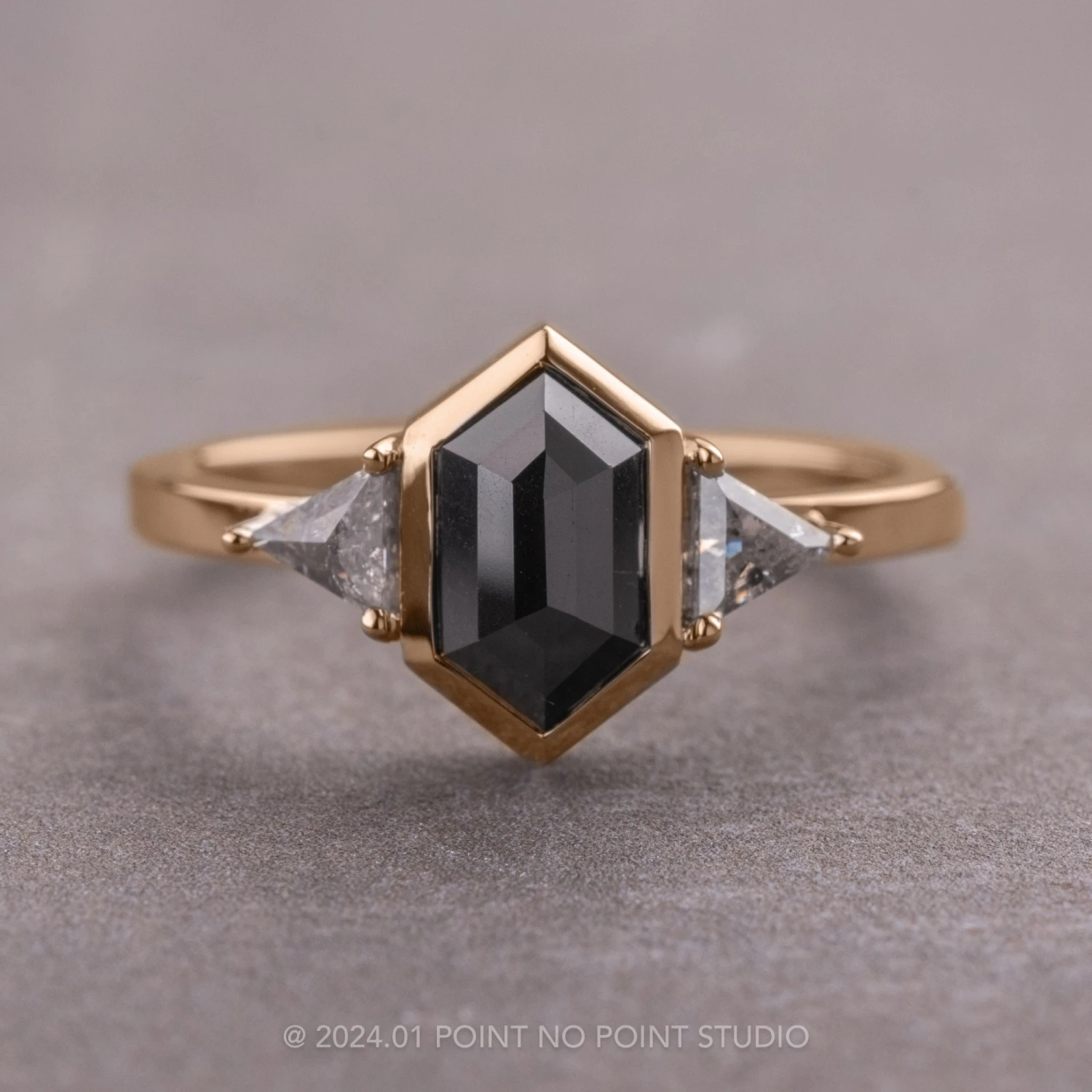 This beautiful ring features a gorgeous 1.65 carat black hexagon shaped center diamond. Flanked on either side of the hexagon diamond are salt and pepper triangle diamonds. The diamonds are top quality natural, non enhanced or treated diamonds.Â
