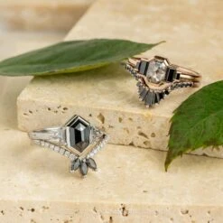 This beautiful ring features a gorgeous 1.65 carat black hexagon shaped center diamond. Flanked on either side of the hexagon diamond are salt and pepper triangle diamonds. The diamonds are top quality natural, non enhanced or treated diamonds.Â