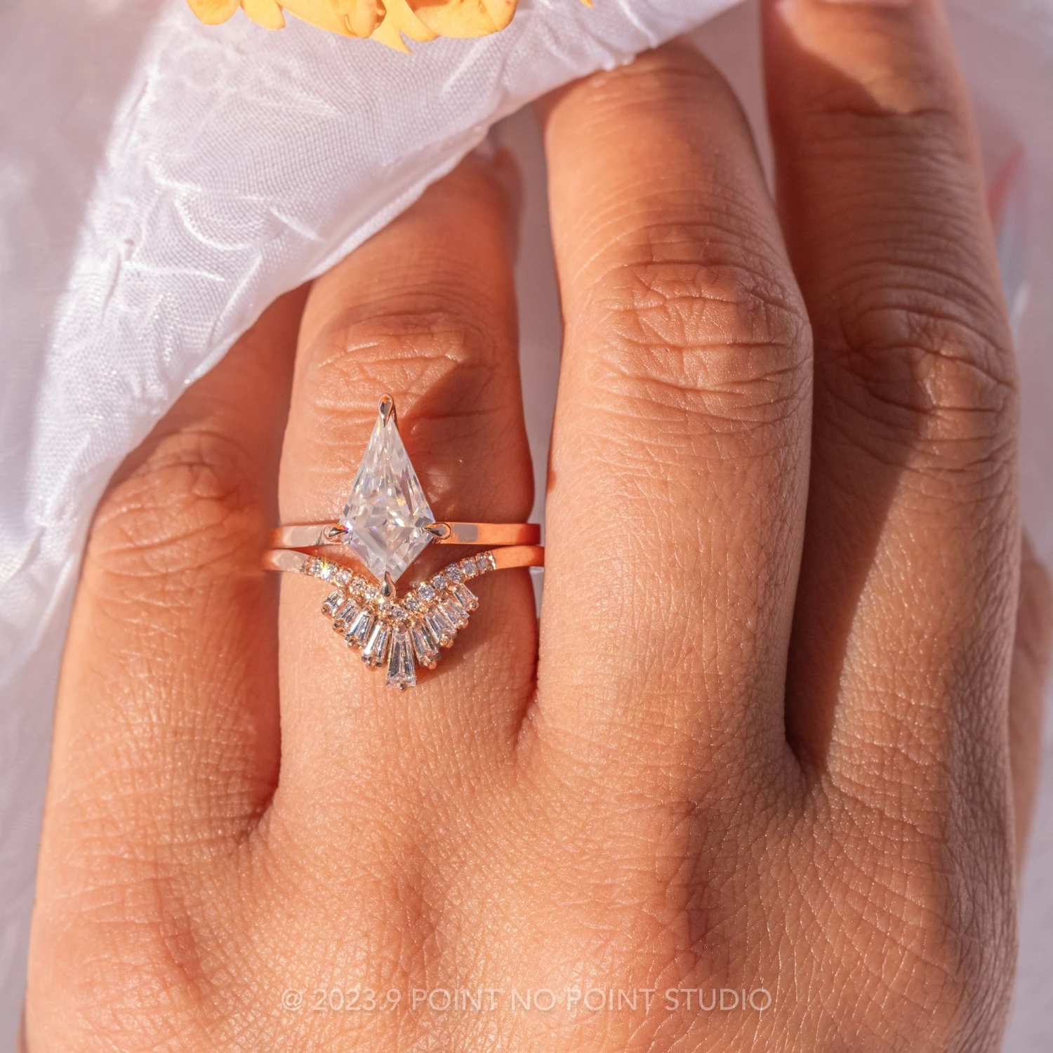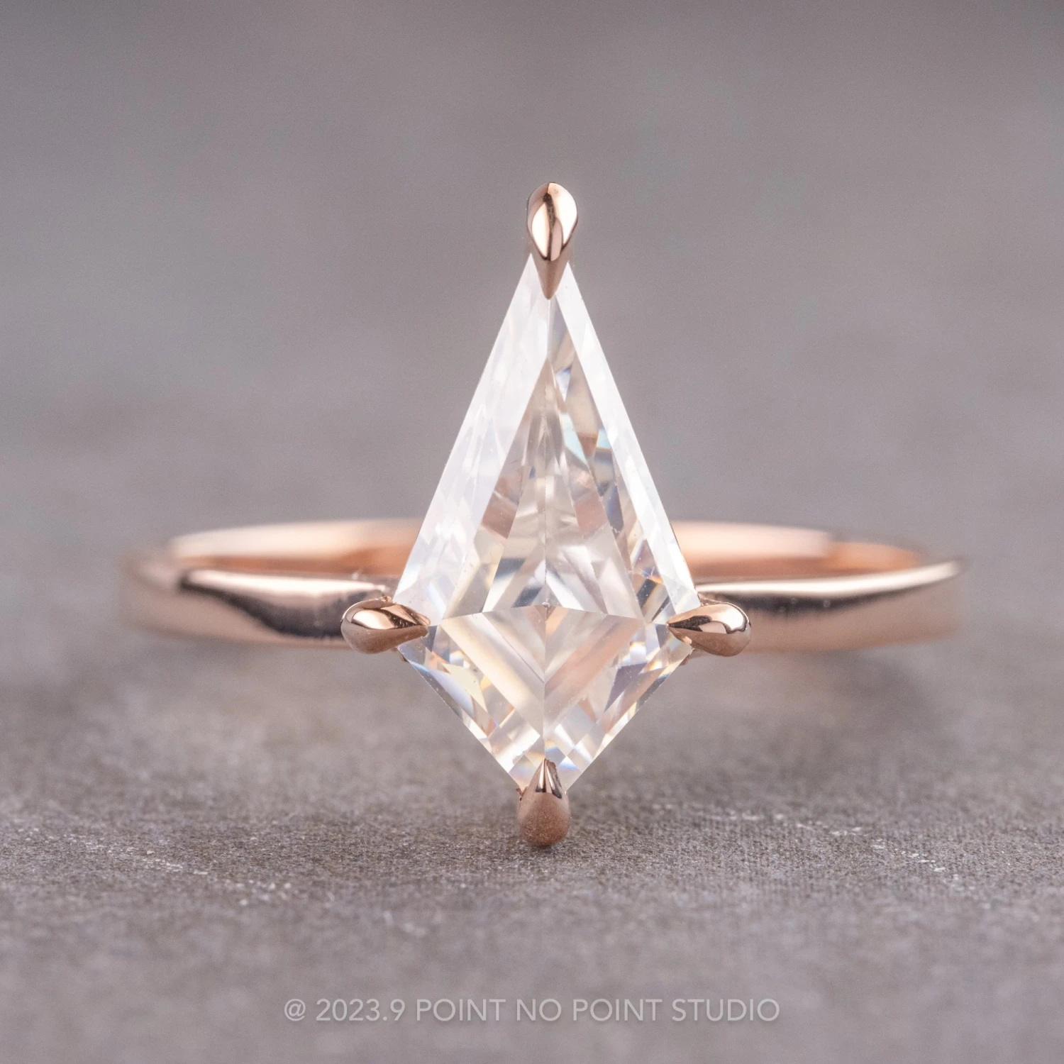 This ring features a gorgeous 2 carat kite-shaped moissanite stone. The stone is completely translucent and sparkles like there is no tomorrow!