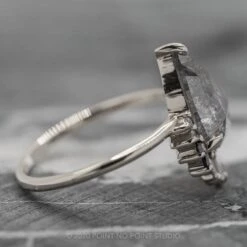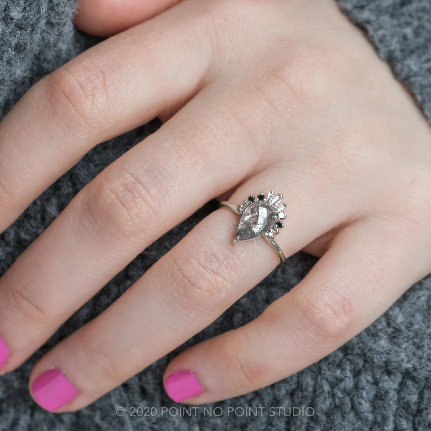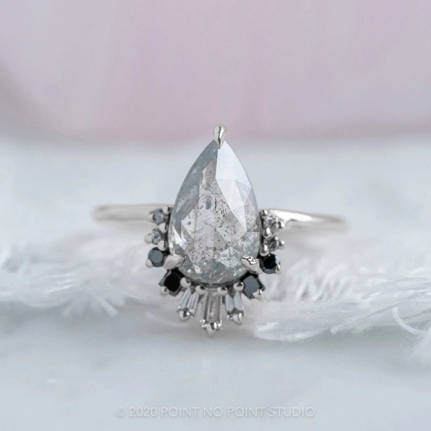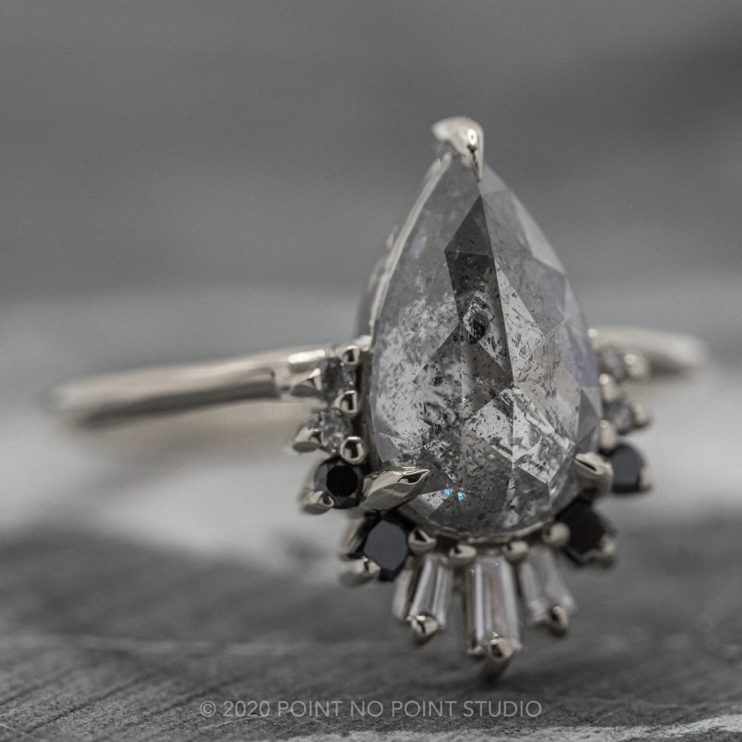 This timeless and unique engagement ring features a striking halo of black, grey, and white diamond in various shapes. The half halo of diamonds sits nestled below a beautiful 2.83 carat salt and pepper pear rose cut diamond. The diamond is a top quality natural diamond; it is semi-translucent with unique tones and facets that catch the light.