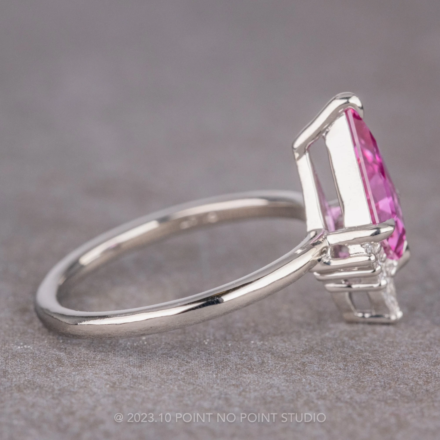 The entire ring is made of recycled platinum; the 1.7mm round ring band is extremely comfortable to wear. The prong setting for the stone was made to be slightly raised with a basket profile to highlight and accommodate the gemstone.
