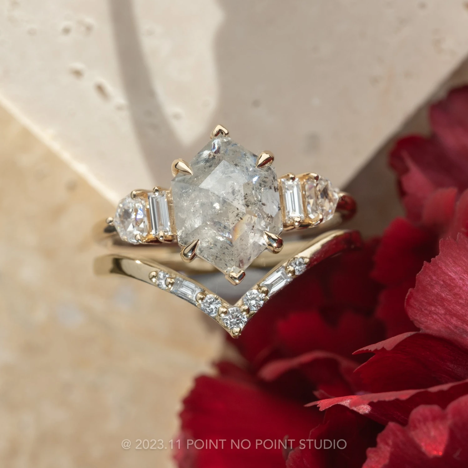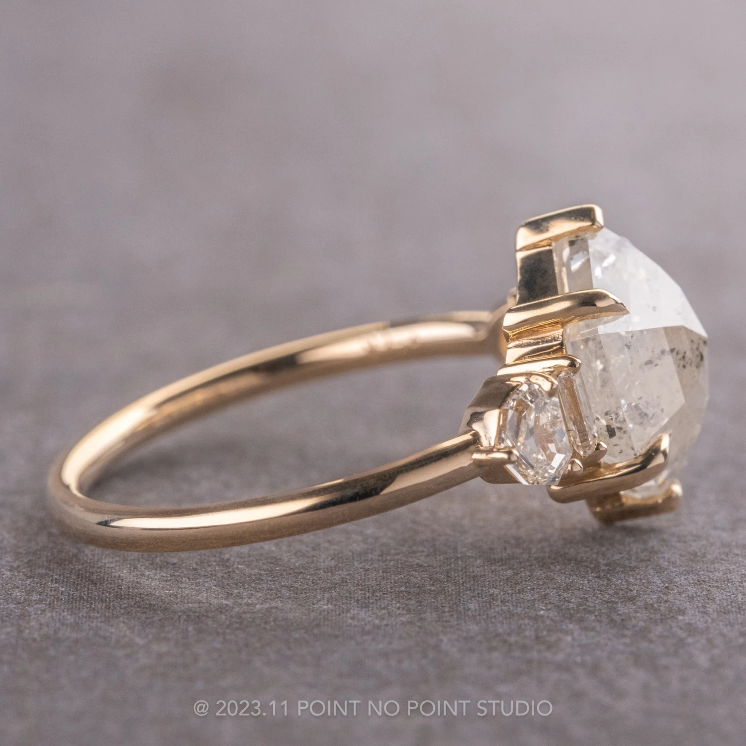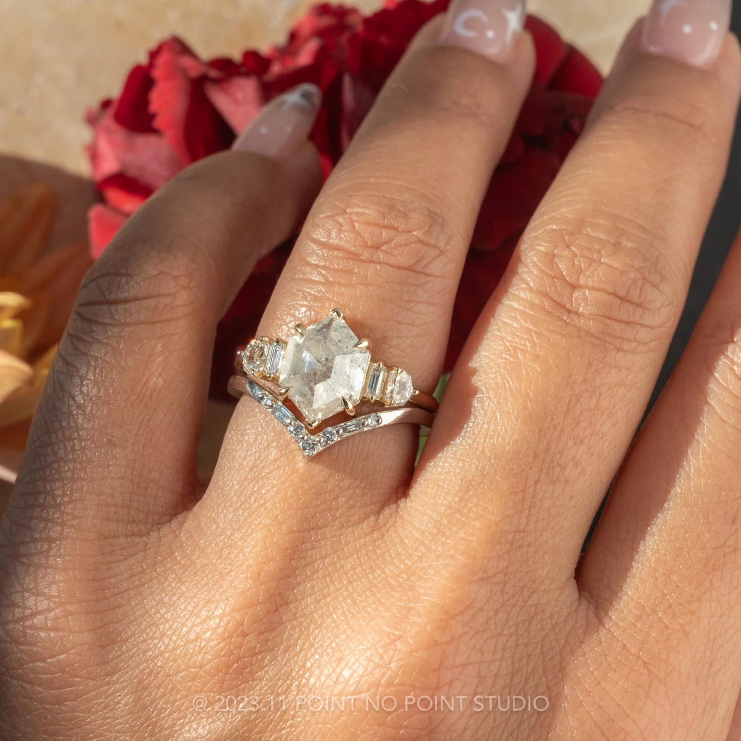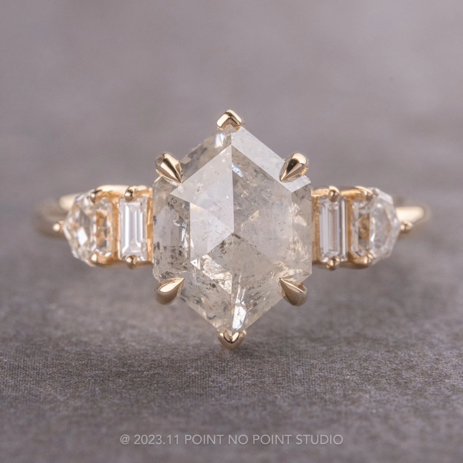 This ring features a stunning 3.20 carat icy white hexagon rose cut diamond. The diamond is a top quality, all natural un-enhanced diamond; it is semi-translucent with unique inner tones and facets that catch the light beautifully. Set on either side of the center stone are GHSI white baguette diamonds, as well as sparkly white cadillac accent diamonds to complete the look!