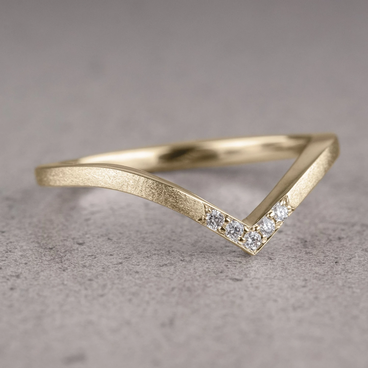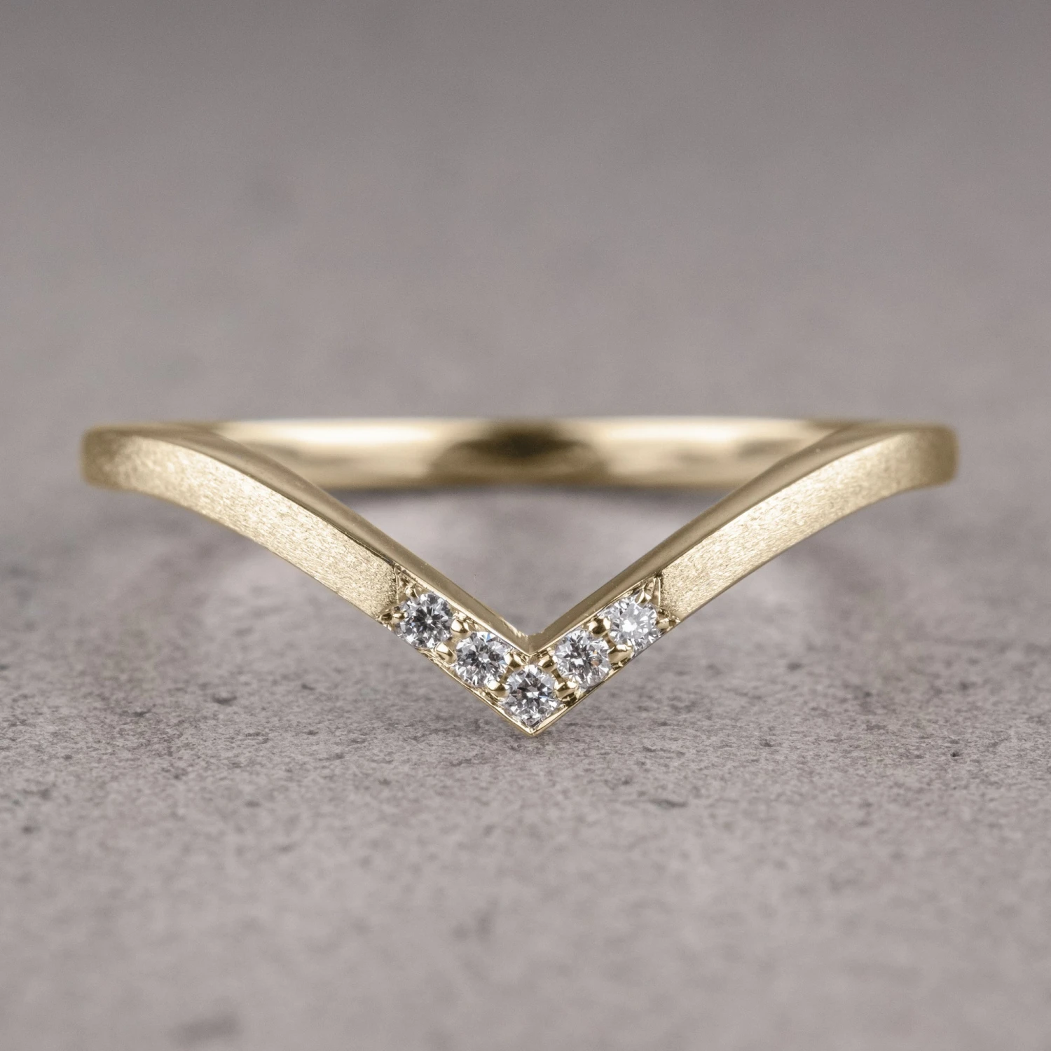 A simple hand crafted V shaped wedding band to be worn alone, stacked in multiples, or to match any number of engagement rings! Set into the tip of the band is .05 carats of white diamonds. The band measures 1.7mm and curves elegantly into a contoured V.Â