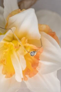 This stunning necklace features a gorgeous .74 carat fancy dark grey pear shaped diamond. The diamond is a top quality natural diamond; it is semi-translucent with unique tones and facets that catch the light. The brilliant cut diamond sits east to west in a sleek bezel setting.Â