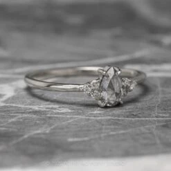 This beautiful and dainty ring features a gorgeous .78 carat salt and pepper pear rose cut diamond. The diamond is a top quality un-enhanced diamond; it is semi-translucent with unique speckling and facets that catch the light. The pear diamond is flanked on either side by a cluster of sparkly GHSI white round accent diamonds that taper seamlessly into the band.