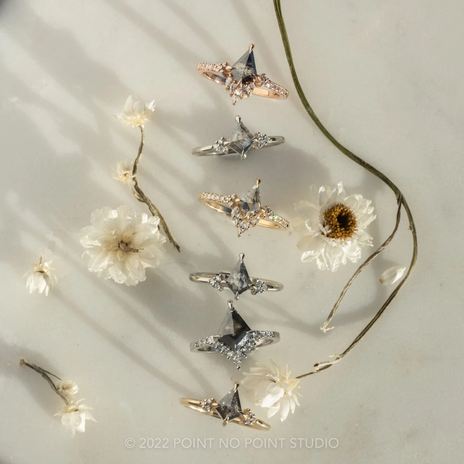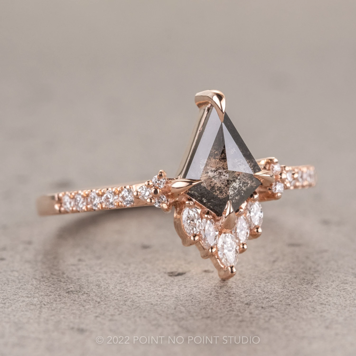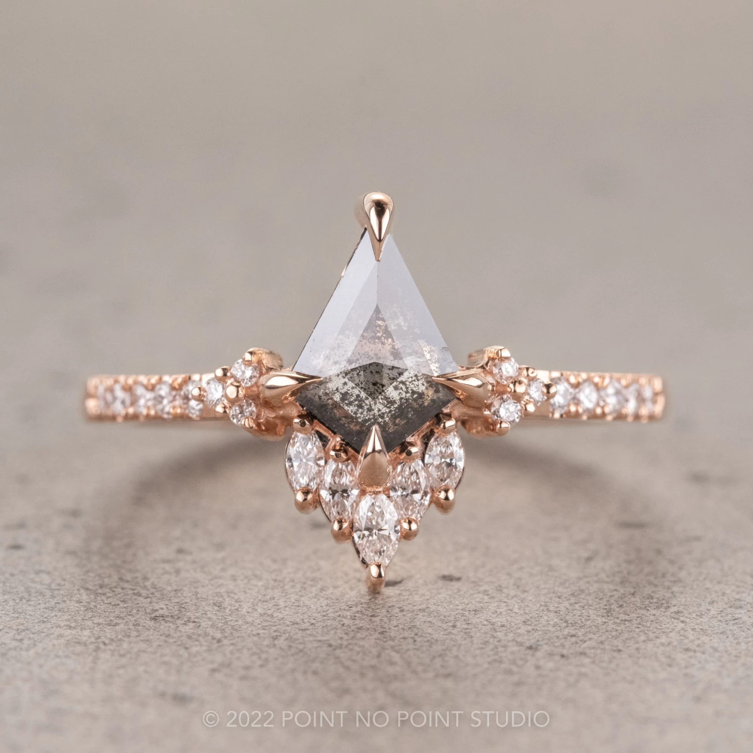 This timeless engagement ring features a striking salt and pepper kite diamond with a unique inner marbling. The diamond is a top quality natural diamond and has been set in a low profile prong setting with a half-halo of faceted white marquise diamonds. Following the gorgeous half halo are equally as brilliant diamonds set into the band.