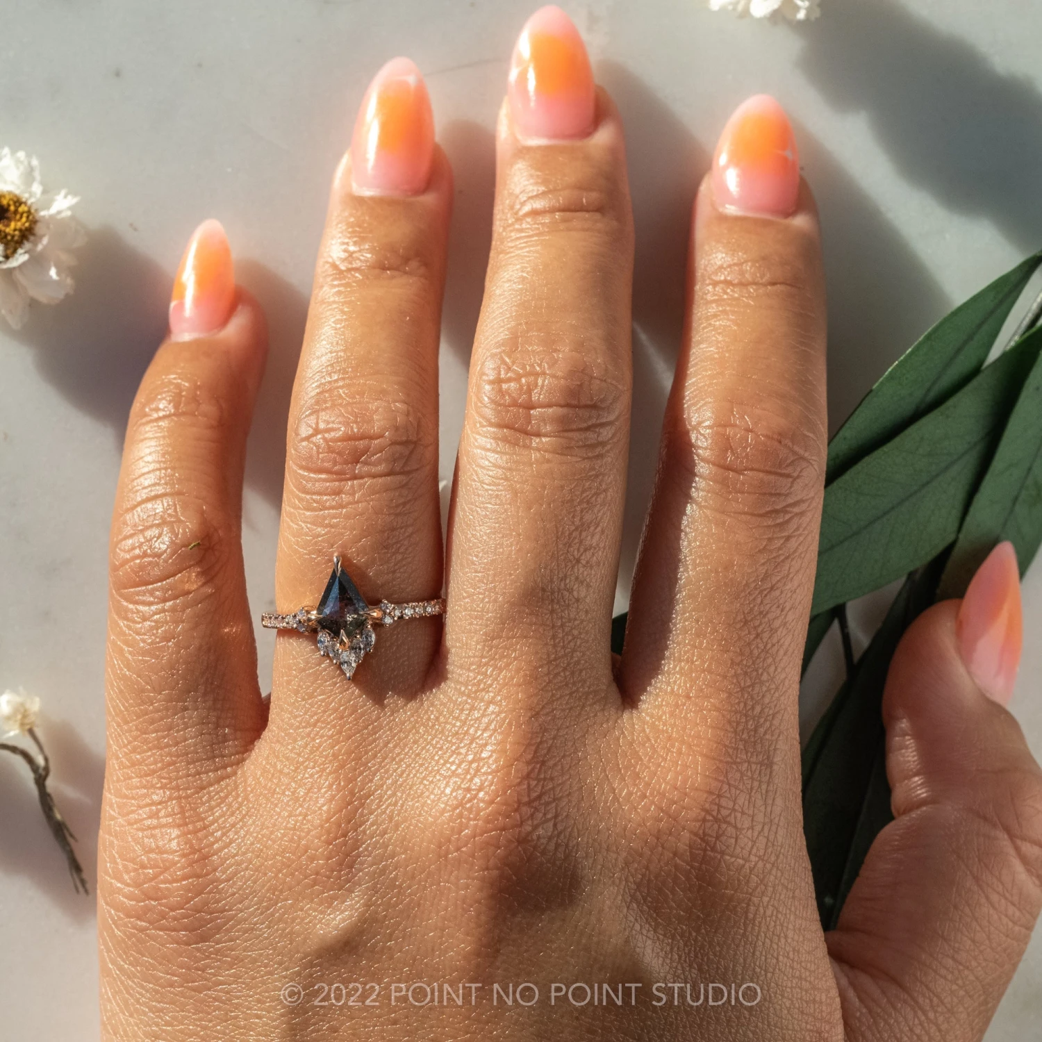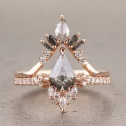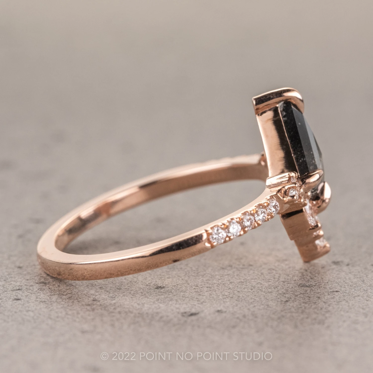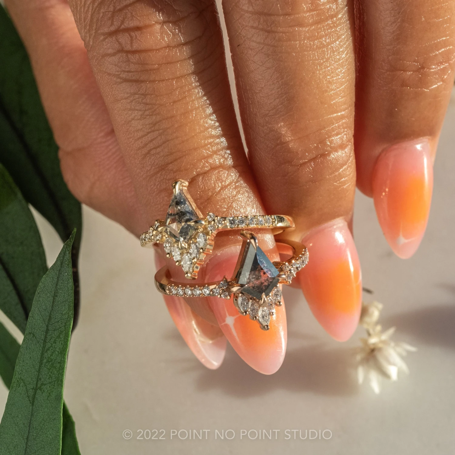 This timeless engagement ring features a striking salt and pepper kite diamond with a unique inner marbling. The diamond is a top quality natural diamond and has been set in a low profile prong setting with a half-halo of faceted white marquise diamonds. Following the gorgeous half halo are equally as brilliant diamonds set into the band.