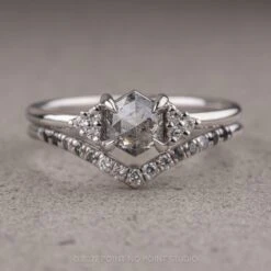 This beautiful and dainty ring features a gorgeous semi translucent salt and pepper hexagon rose cut diamond. The diamond is natural in color and ranges in tones from charcoal grey to black. The rose cut diamond is flanked by .06 tcw GHSI brilliant cut diamonds.