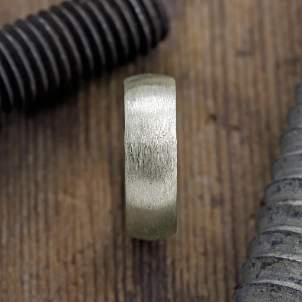This ring is made of solid recycled eco friendly 14k recycled white gold. The band is so simple and traditional. The outside of the ring has been given a brushed matte finish and the inside and edges of the ring a high polished finish.