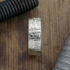 This ring is made of solid recycled eco friendly 14k recycled white gold. The band is so simple and traditional. The outside of the ring has been given a hand textured finish and the entirety of the ring has a high polished finish.