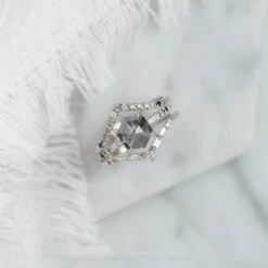 This captivating ring features a .82 carat hexagon rose cut diamond. The diamond is a top quality natural stone, the color of the diamond is black with speckles. Set on either side of the center stone are 5 diamonds that gradient in color. Each side of the hexagon diamond has white, silver, and black diamond set into the ring shank. Â