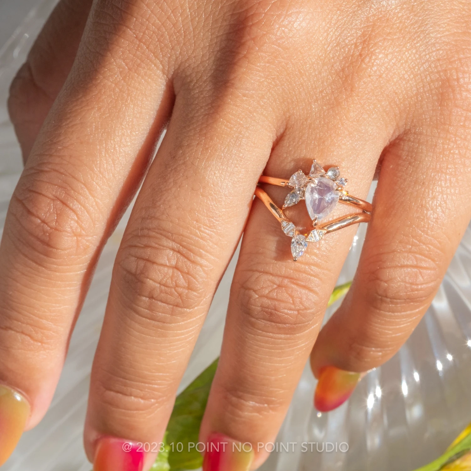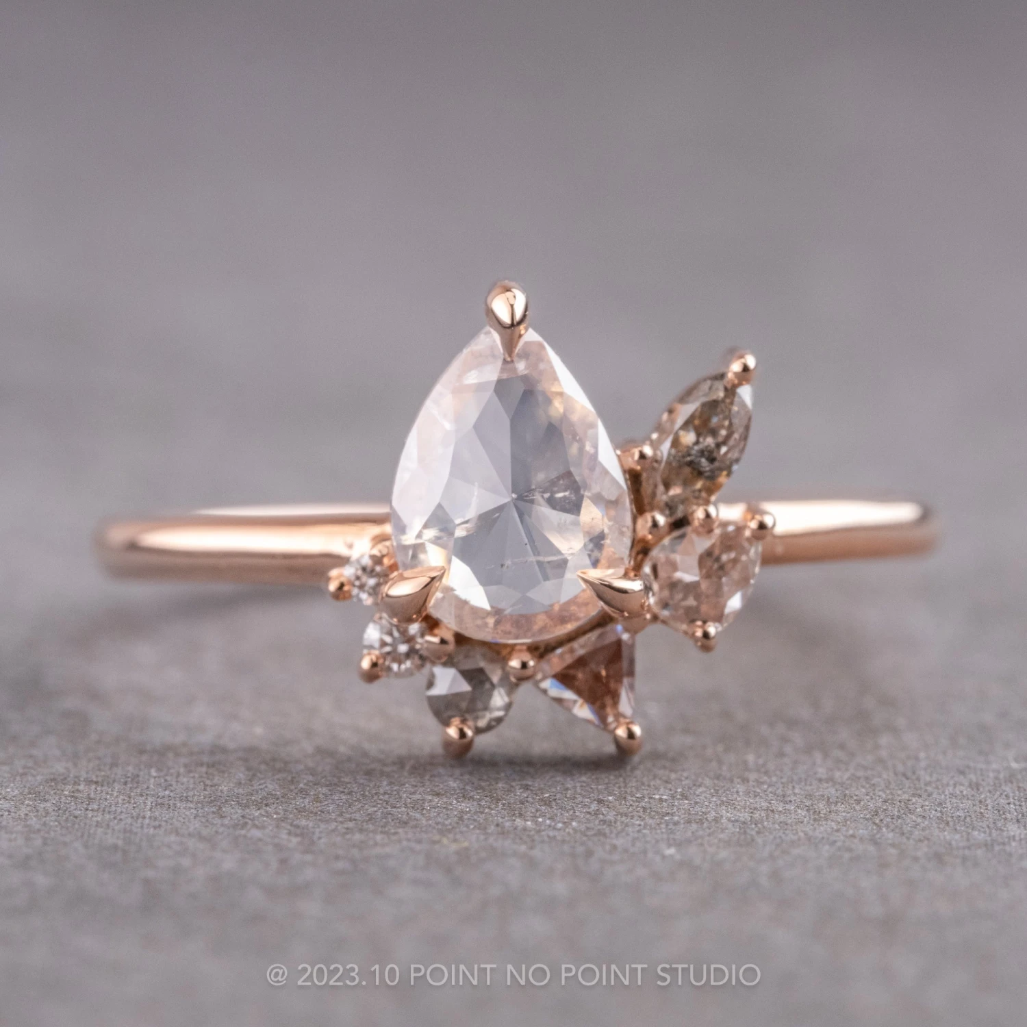 This amazing ring features a unique mix of diamond shapes. In the center of the setting is a natural pear icy white rose cut diamond. The unique asymmetrical halo bursts outward and has an assortment of different shapes making this an eye catching setting. The low profile 3 prong setting was made to sit directly on the finger. The entire ring is made of recycled 14k rose gold.Â