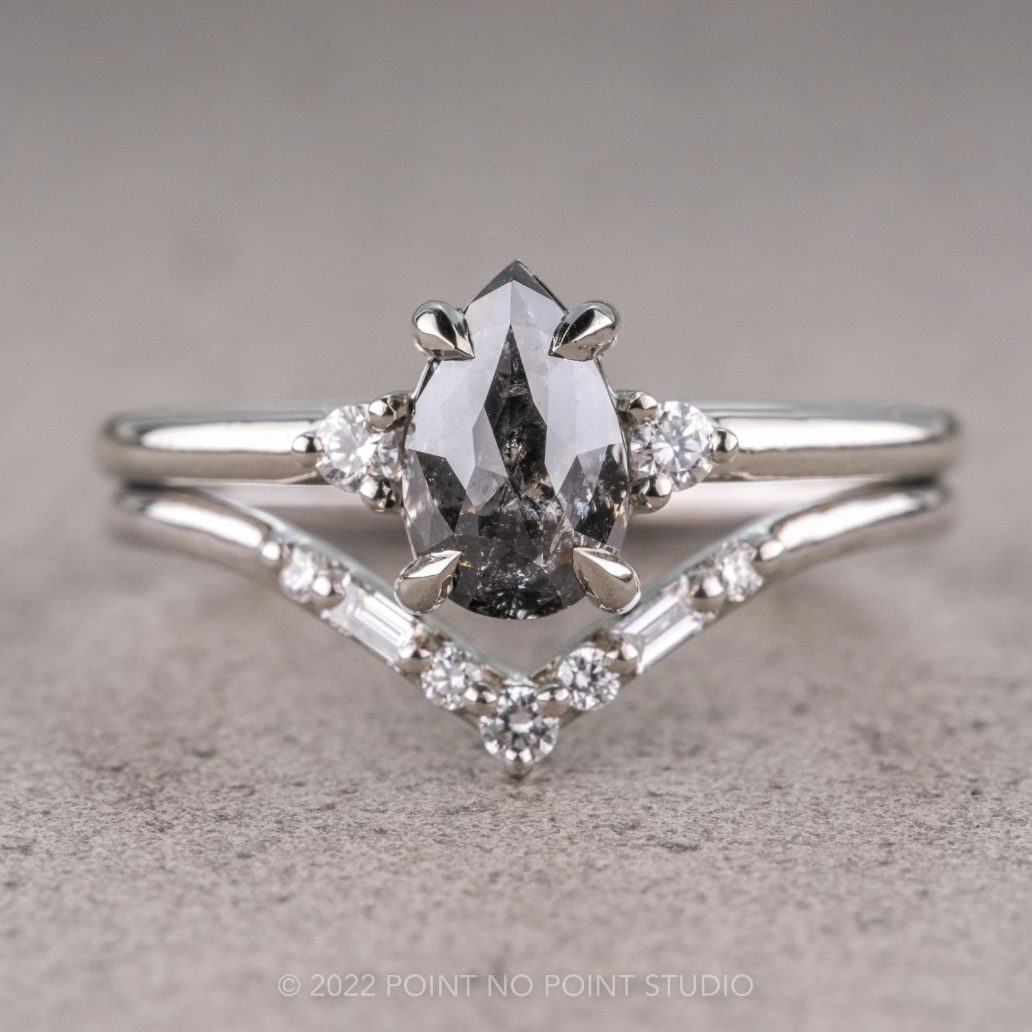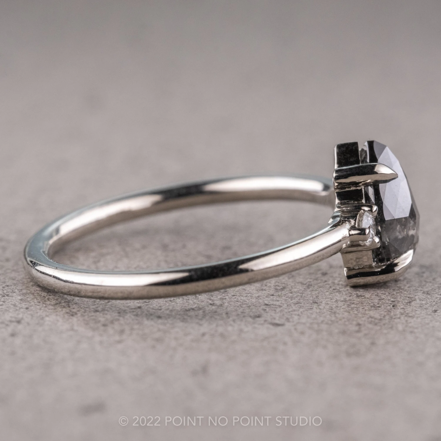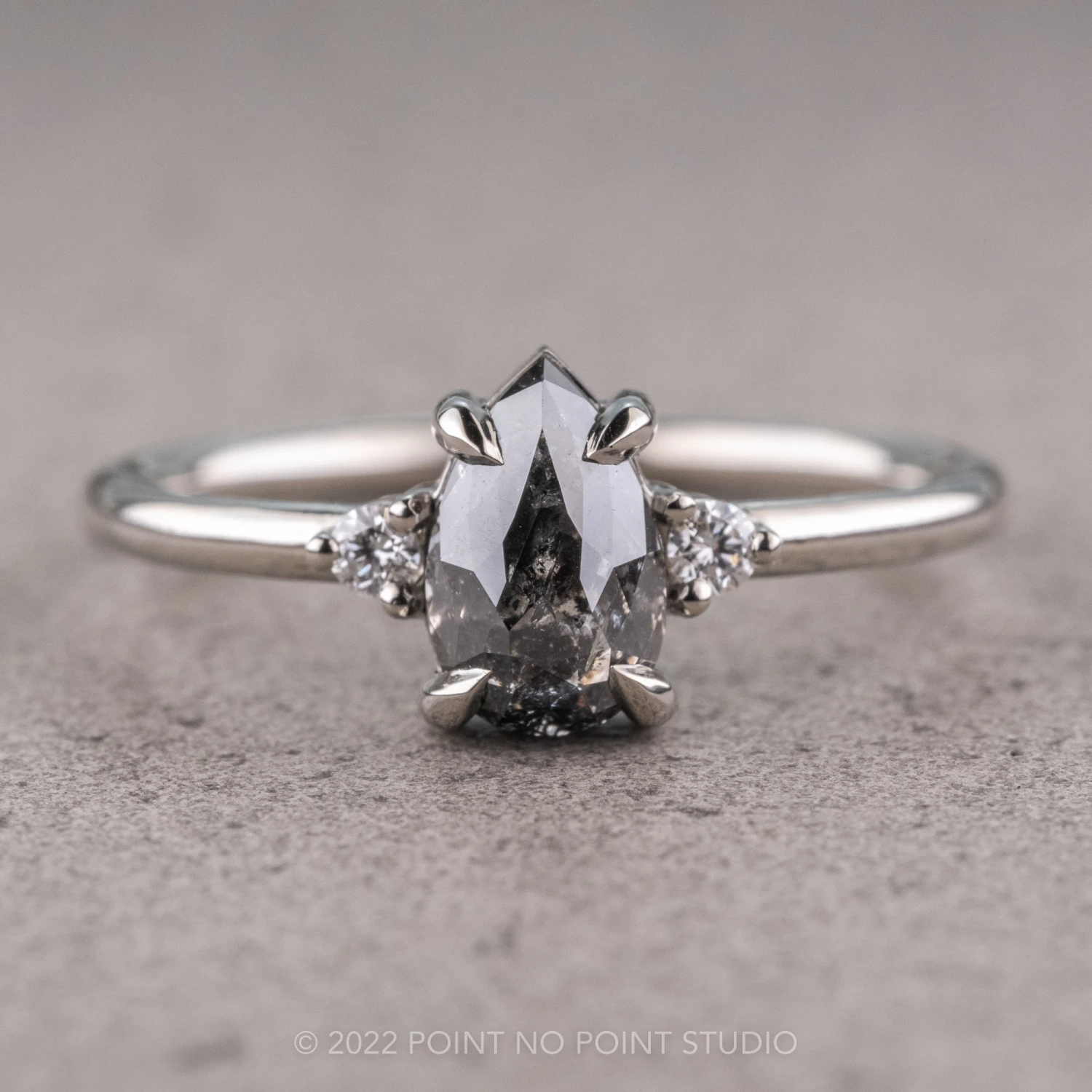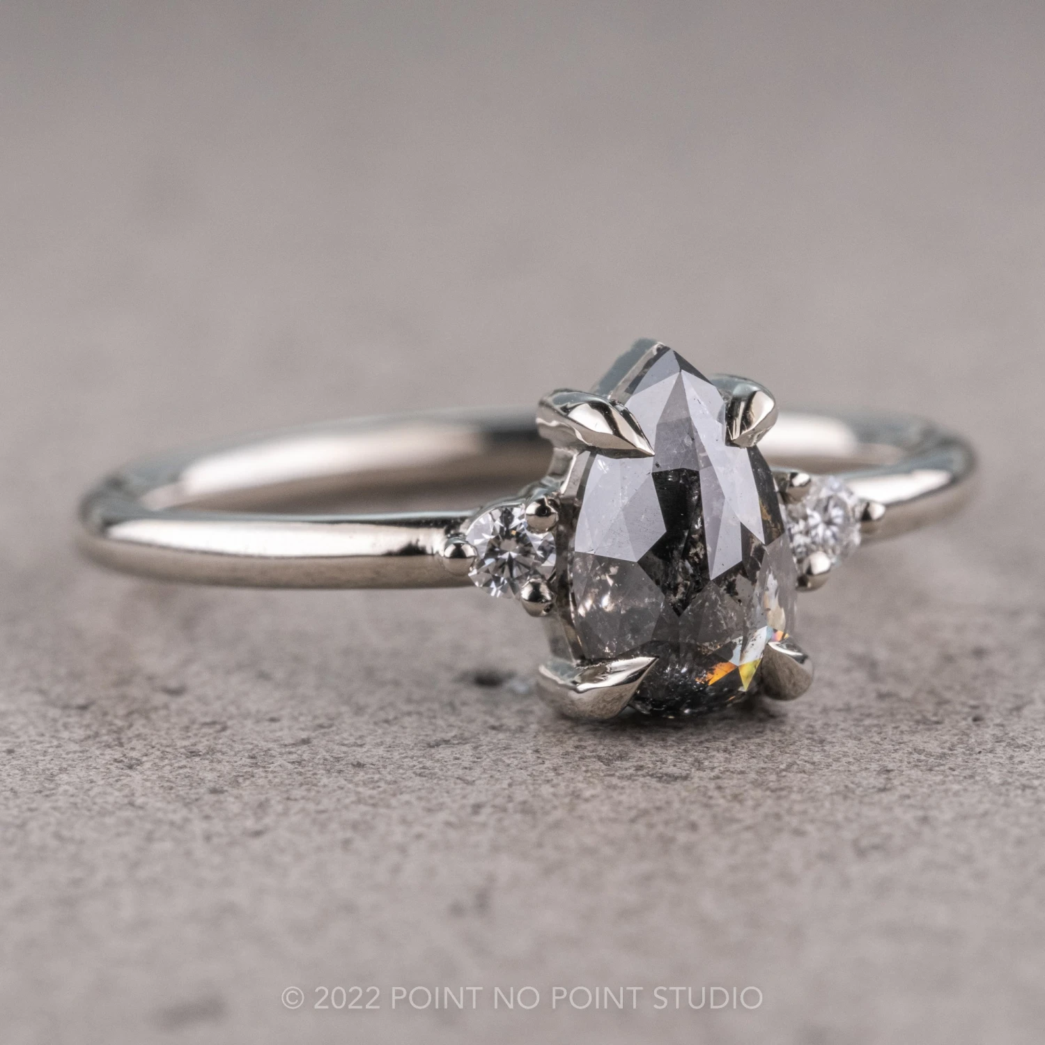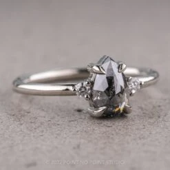 This ring features a beautiful .88 carat salt and pepper rose cut pear shaped diamond. The diamond is a top quality, un-enhanced, semi translucent natural salt and pepper diamond; set on either side of the center stone are white round brilliant cut accent diamonds.