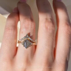 This engagement ring features a mesmerizing .78 carat salt and pepper pear shaped rose cut diamond. The pear diamond is a top quality natural diamond; it is semi-translucent with unique tones and facets that catch the light. Flanked on both sides by a GHSI white round brilliant cut accent diamond, followed by three smaller white round brilliant cut diamonds set into the ring band to complete the look.Â