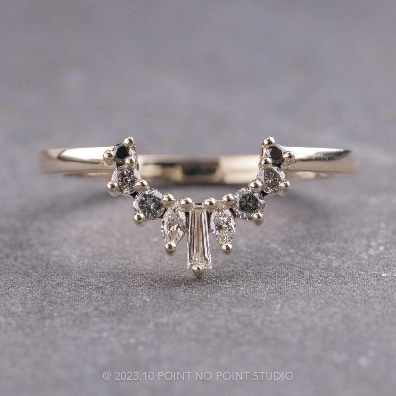 This timeless and unique wedding ring features a striking natural baguette diamond at the center of the contour. The tapered baguette diamond is accented by a gradient of white, grey and black diamonds in various shapes. This rounded wedding band can be worn alone, stacked in multiples or to match any number of PNPS engagement rings!
