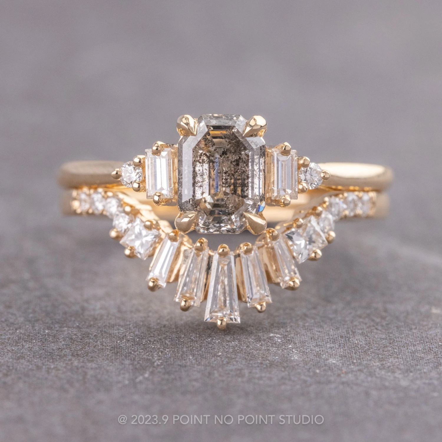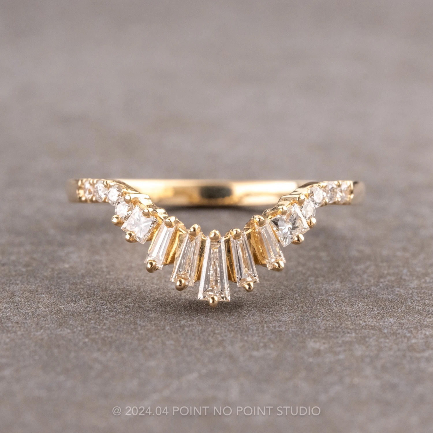 This timeless and unique wedding ring features striking white baguette diamonds accented by natural GHSI princess cut and round diamonds in a softly contouring style that will complement many different engagement ring styles!Â