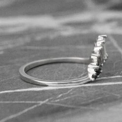 This timeless and unique wedding ring features black, silver, and white diamonds in a softly contouring style that will complement many different engagement ring styles!Â