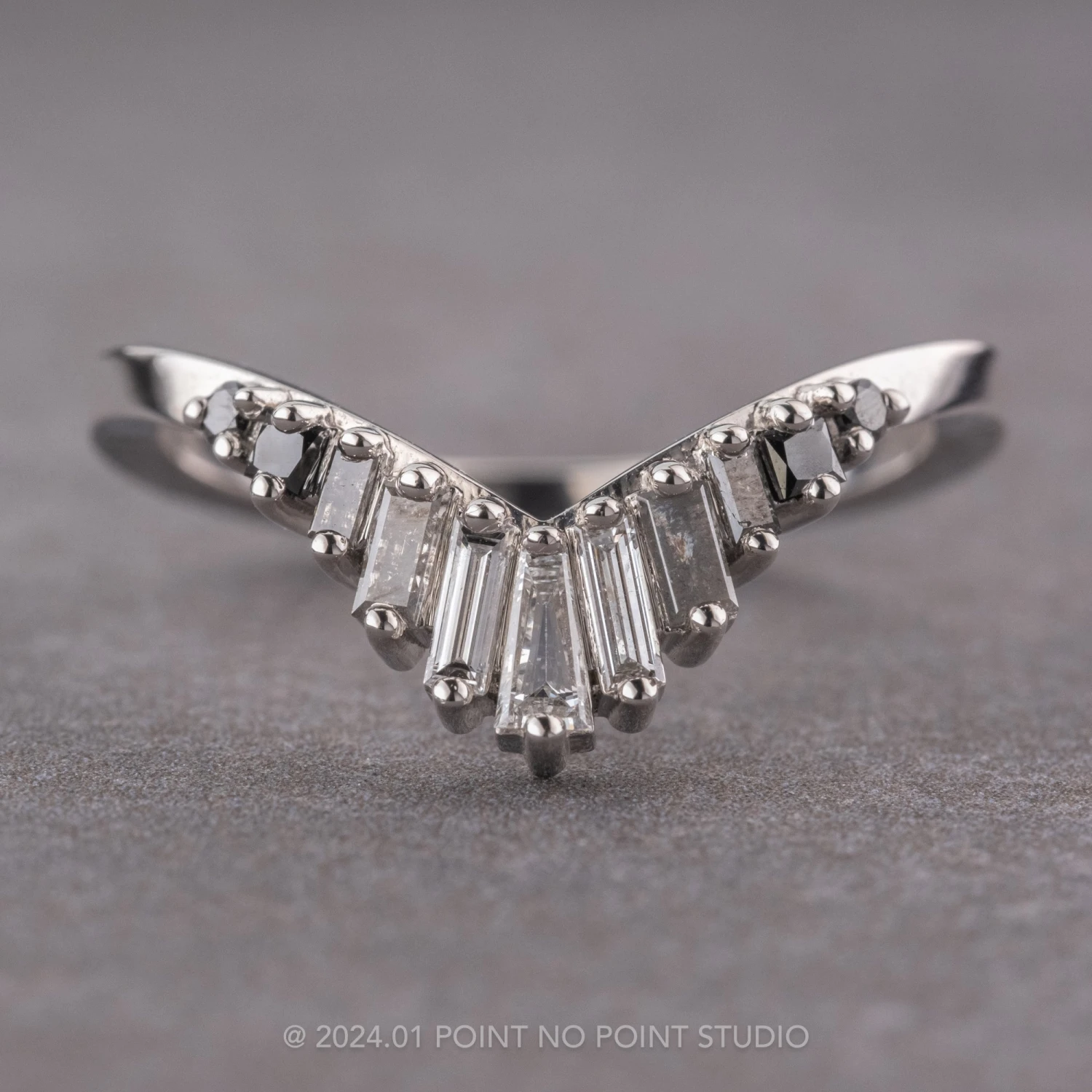 This timeless and unique wedding ring features black, silver, and white diamonds in a softly contouring style that will complement many different engagement ring styles!Â