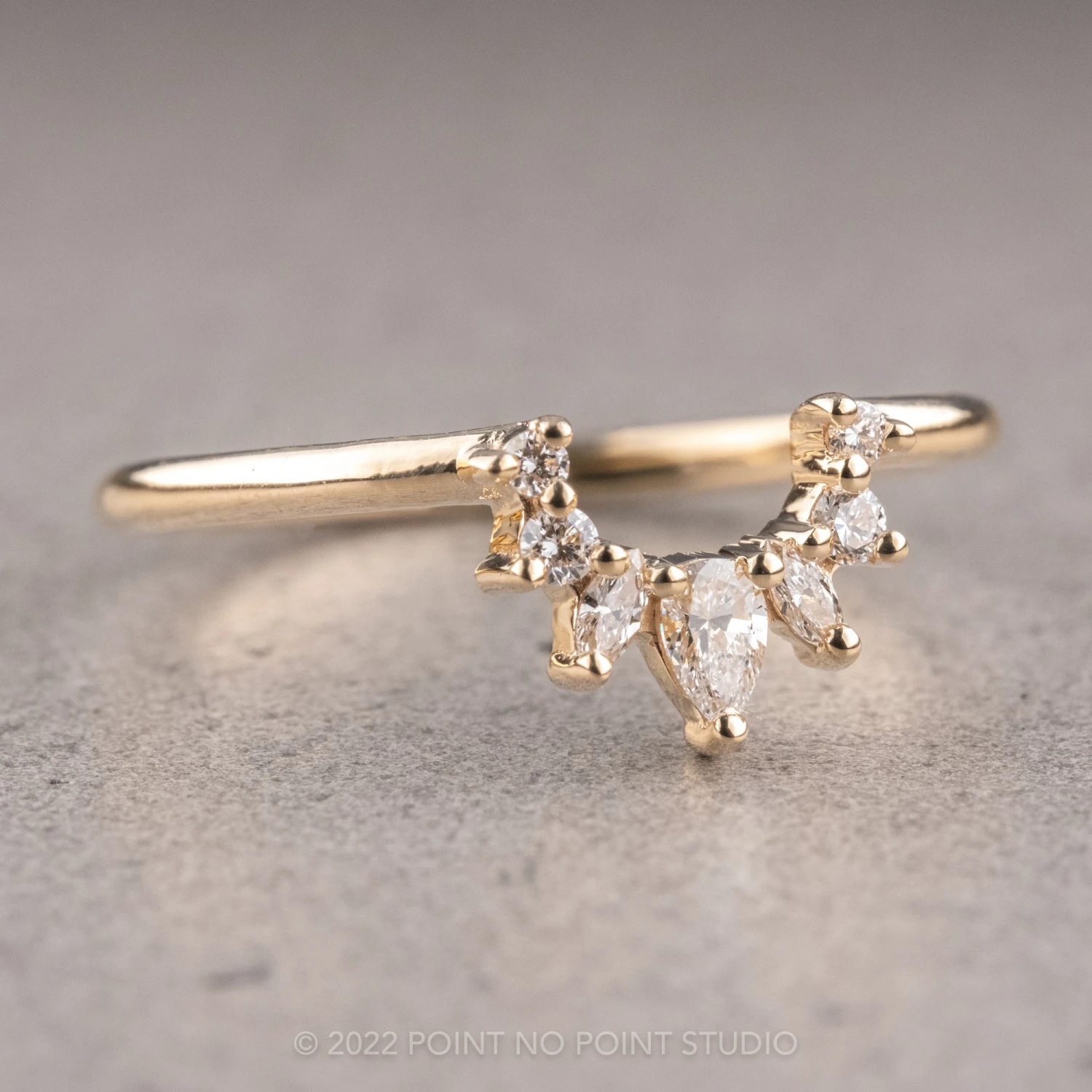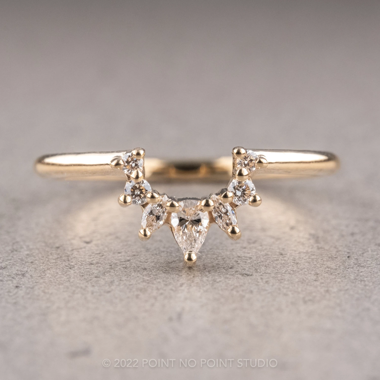 This unique ring features a contoured row of white GHSI faceted brilliant cut diamonds – the focal point being the center pear shaped diamond. The different diamond shapes create a truly unique profile and design that will set off just about any engagement ring.Â