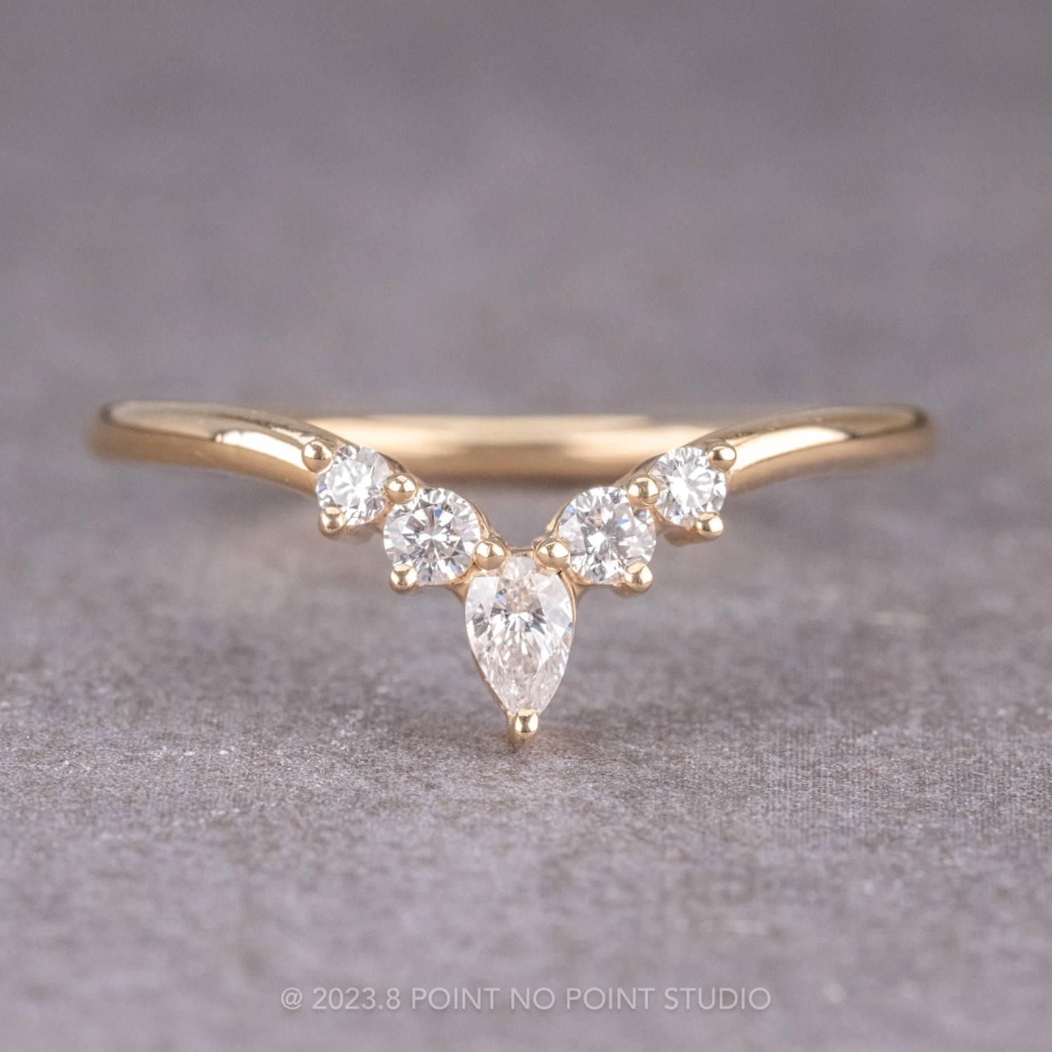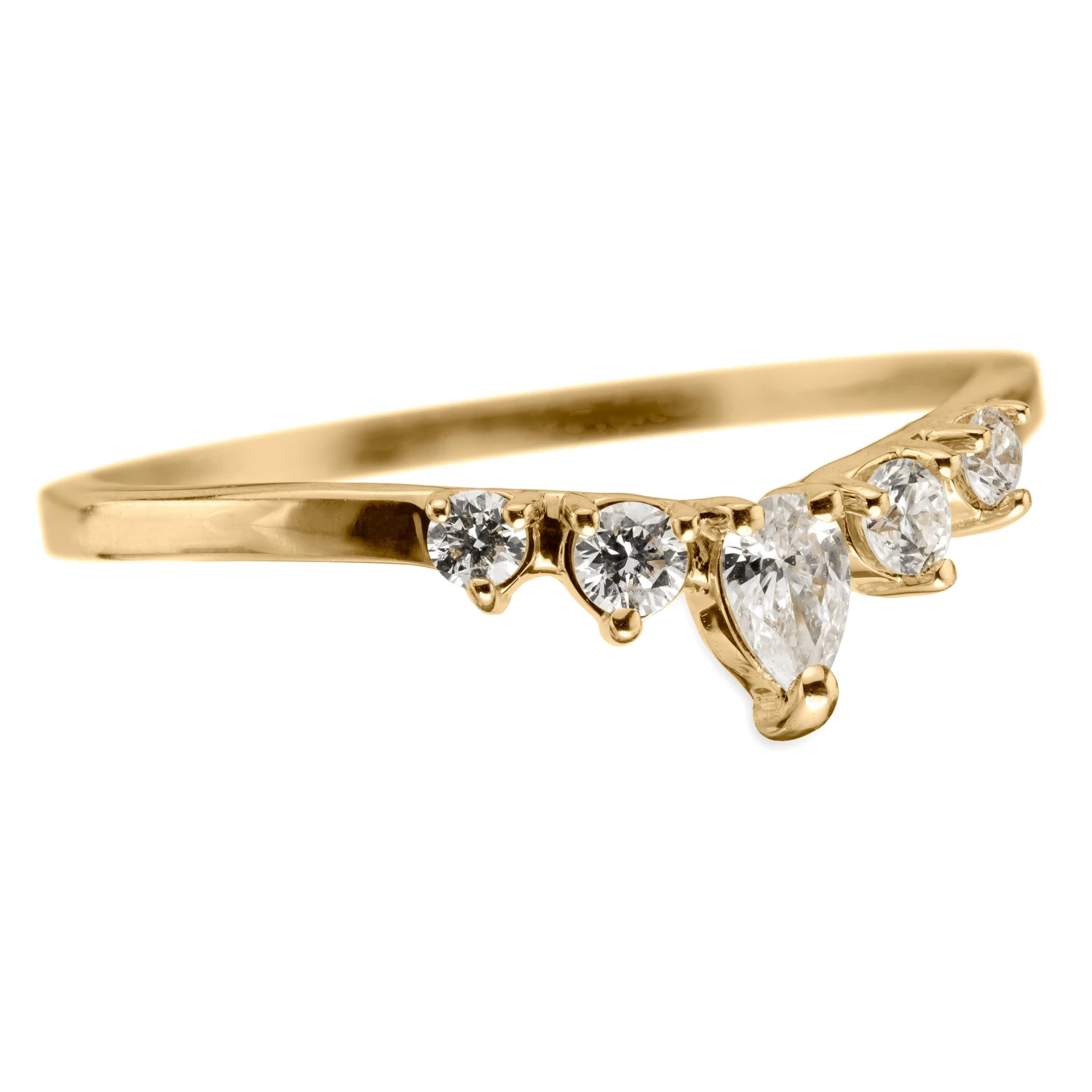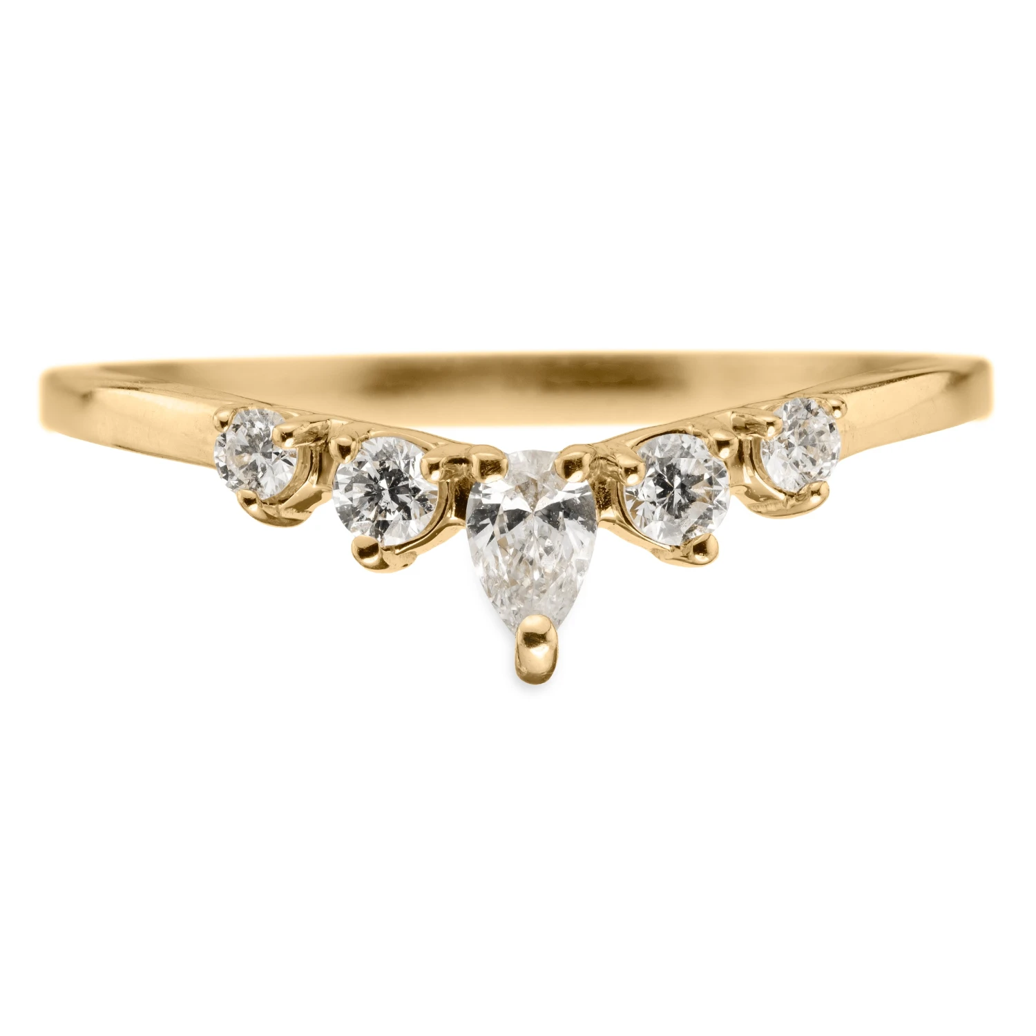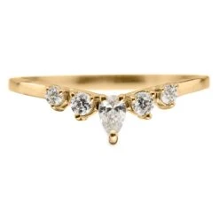 This timeless and unique wedding ring features striking natural GHSI brilliant cut diamonds. A white pear diamond is the central focal point. The ring has a soft diamond contoured curve, which will flatter many engagement ring styles.Â