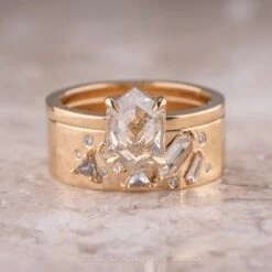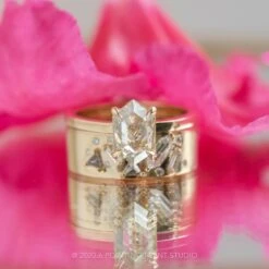 The magical ring features a versatile cut out design that will complement almost any engagement ring! The cut out design allows the ring to sit on the sides of just about any engagement ring stone. The entire ring is made of eco friendly 14K yellow gold.