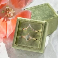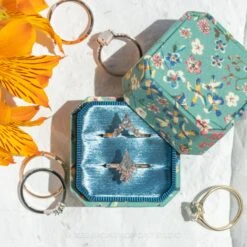 This patterned velvet box has a gorgeous small octagonal shape, with 2 ring slots to showcase 2 rings – perfect to show a stacked engagement ring/wedding band set!Â