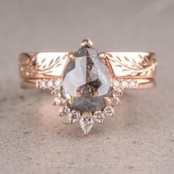 The unique ring features a versatile open cuff design that will complement almost any engagement ring! The open cuff design allows the ring to sit on the sides of just about any engagement ring stone. The entire ring is made of eco friendly 14K Rose Gold. The ring has a leaf engraving that is hand engraved by our jewelers.Â