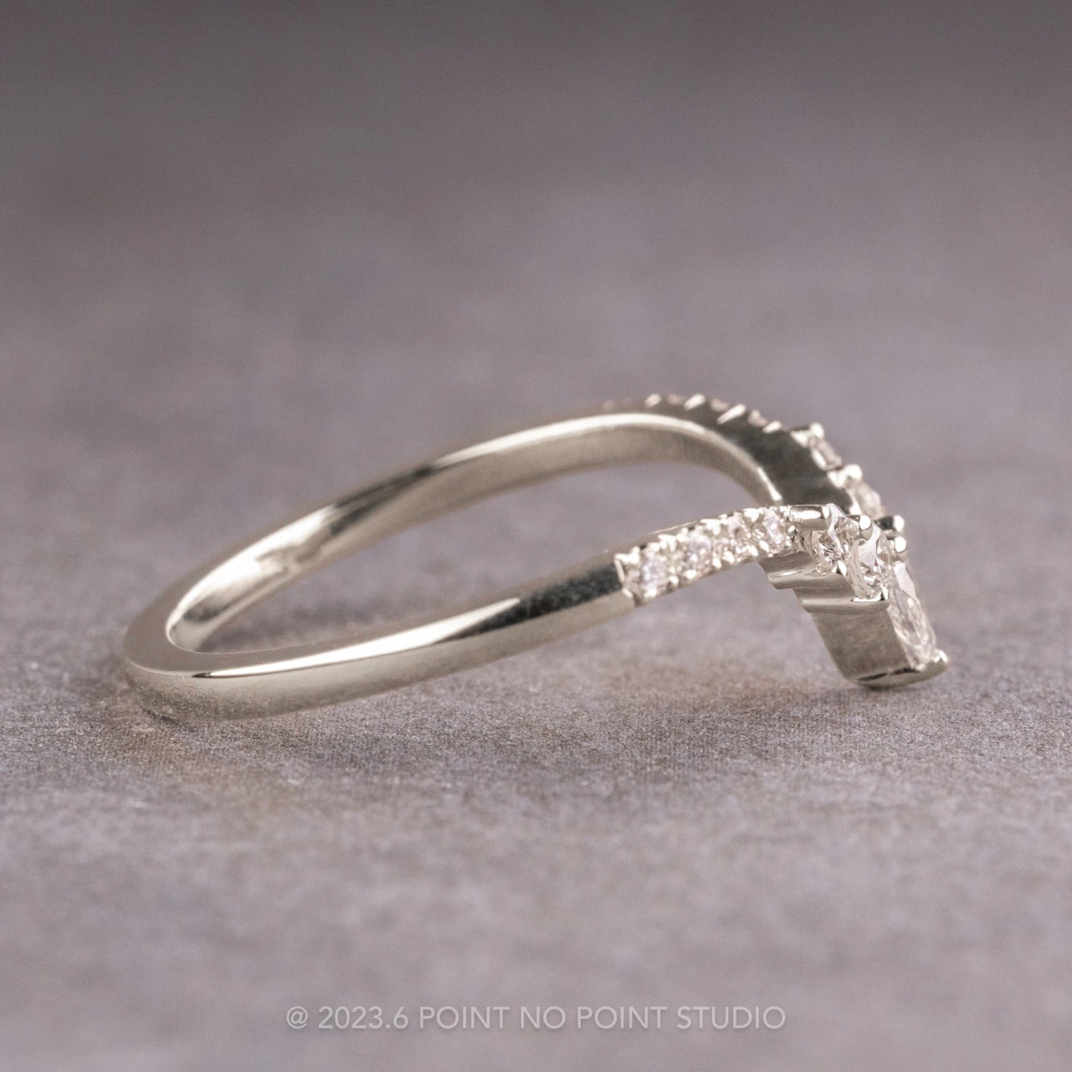 This timeless and unique wedding ring features striking natural GHSI brilliant cut diamonds. A white pear diamond is the central focal point. The ring has a soft diamond contoured curve, which will flatter many engagement ring styles.Â