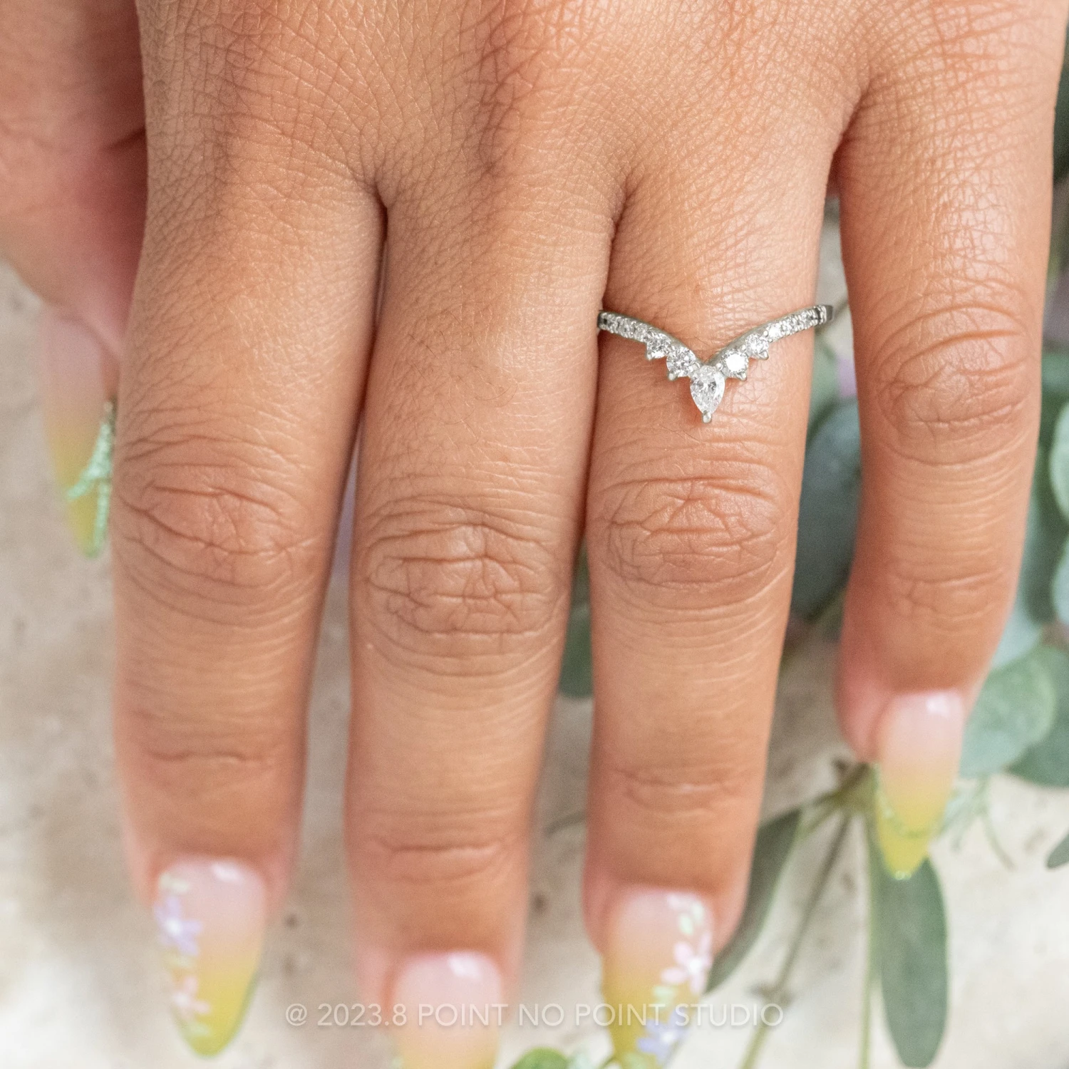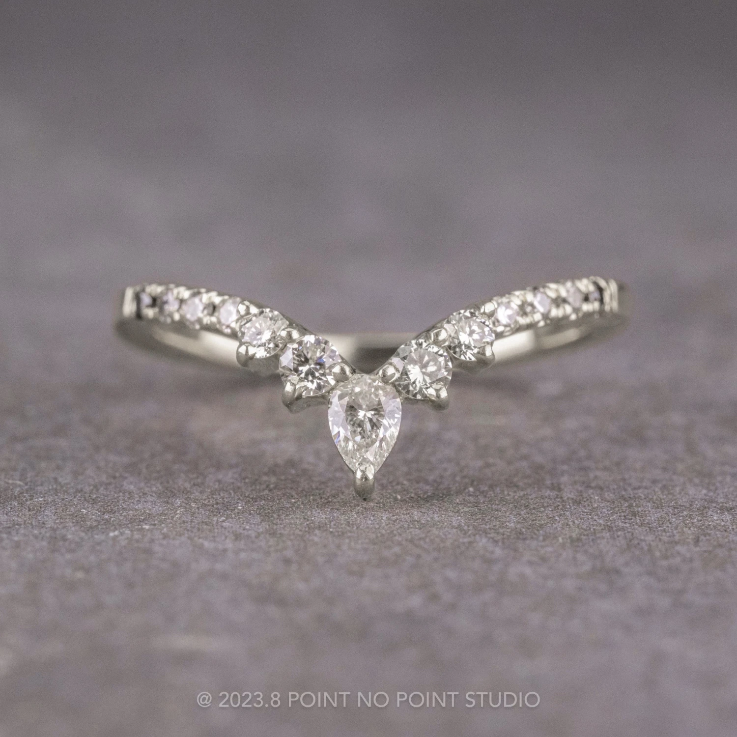 This stunning ombre wedding ring features a v-contour of white, grey and black diamonds that gradient in color, with a striking GHSI pear diamond at the tip. This band can be worn alone, stacked in multiples or to match any number of engagement rings!