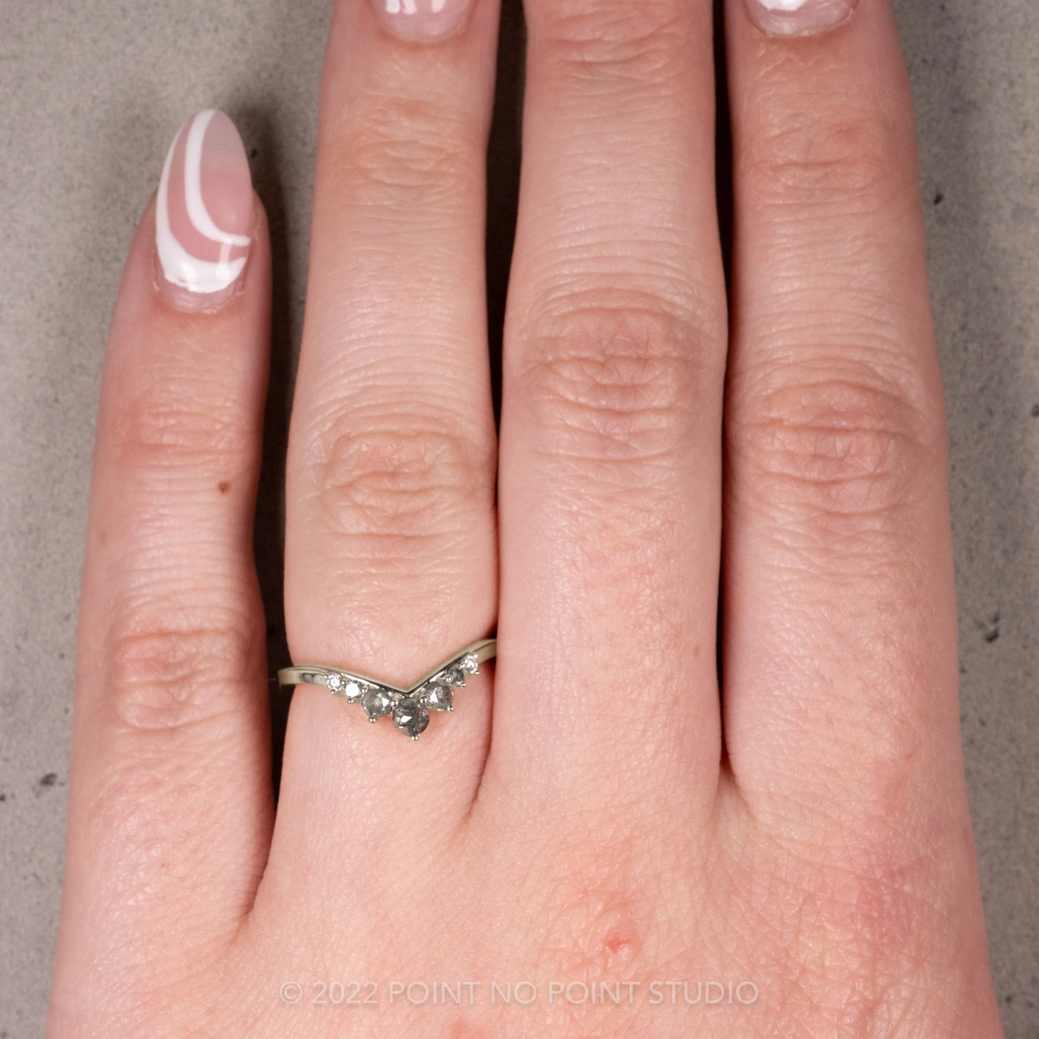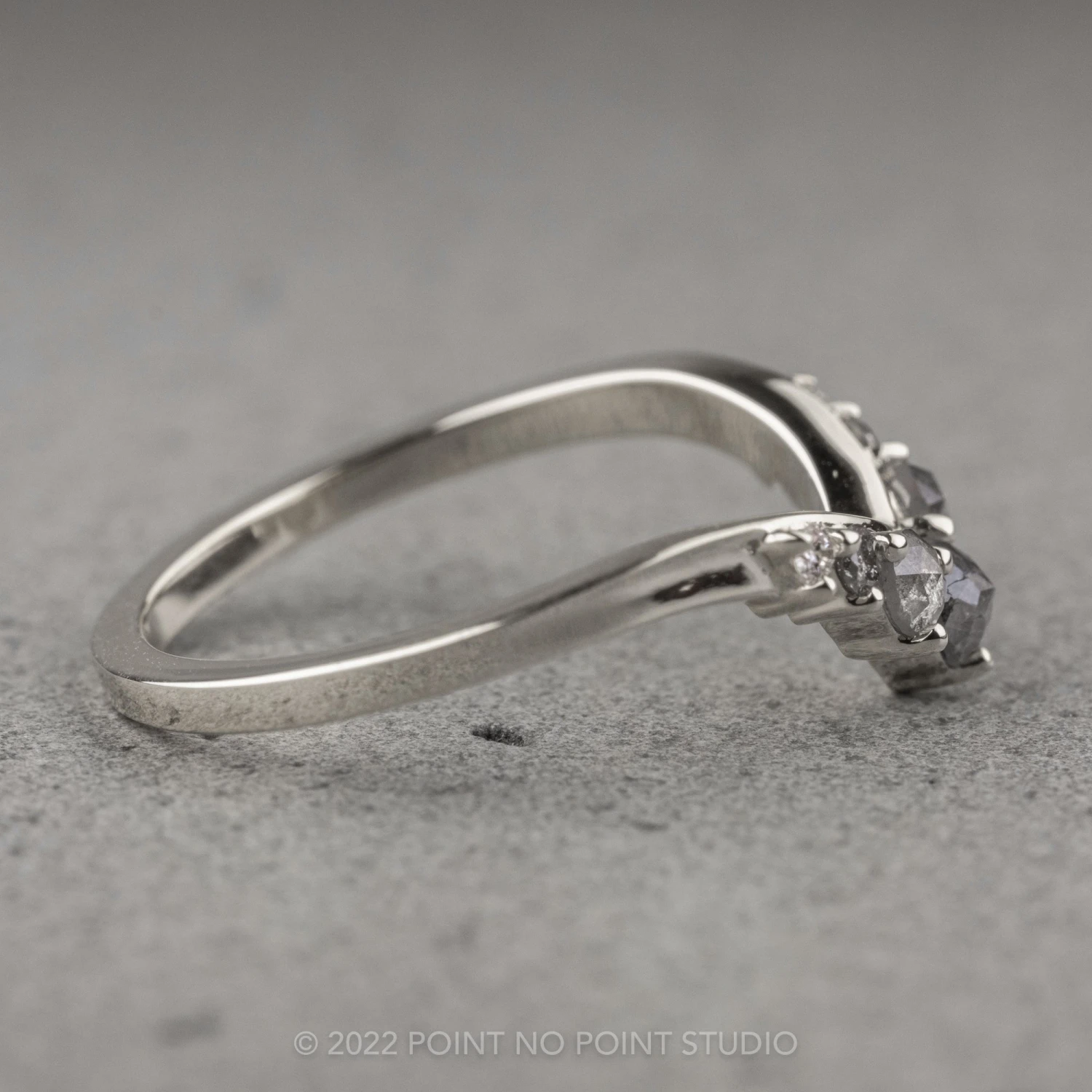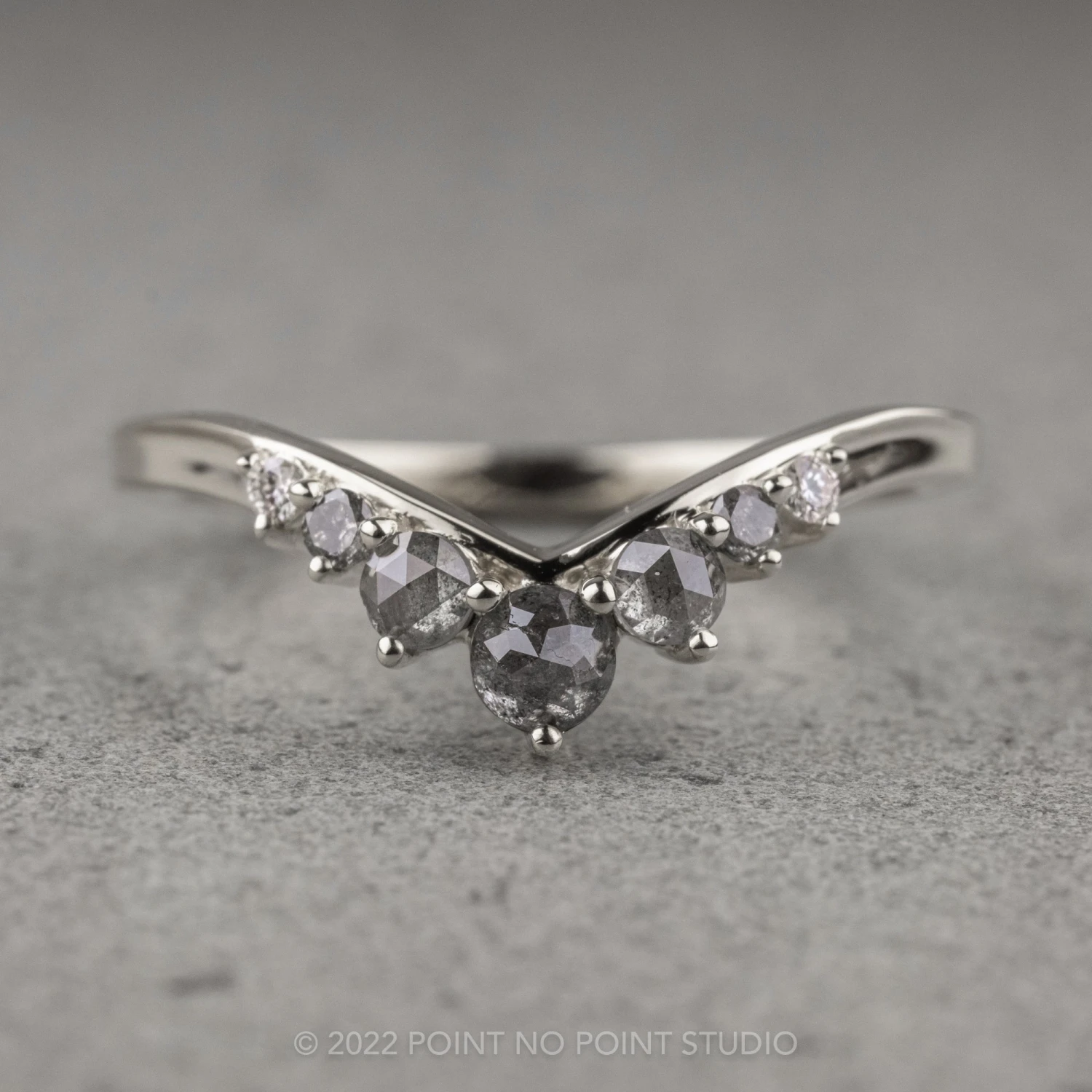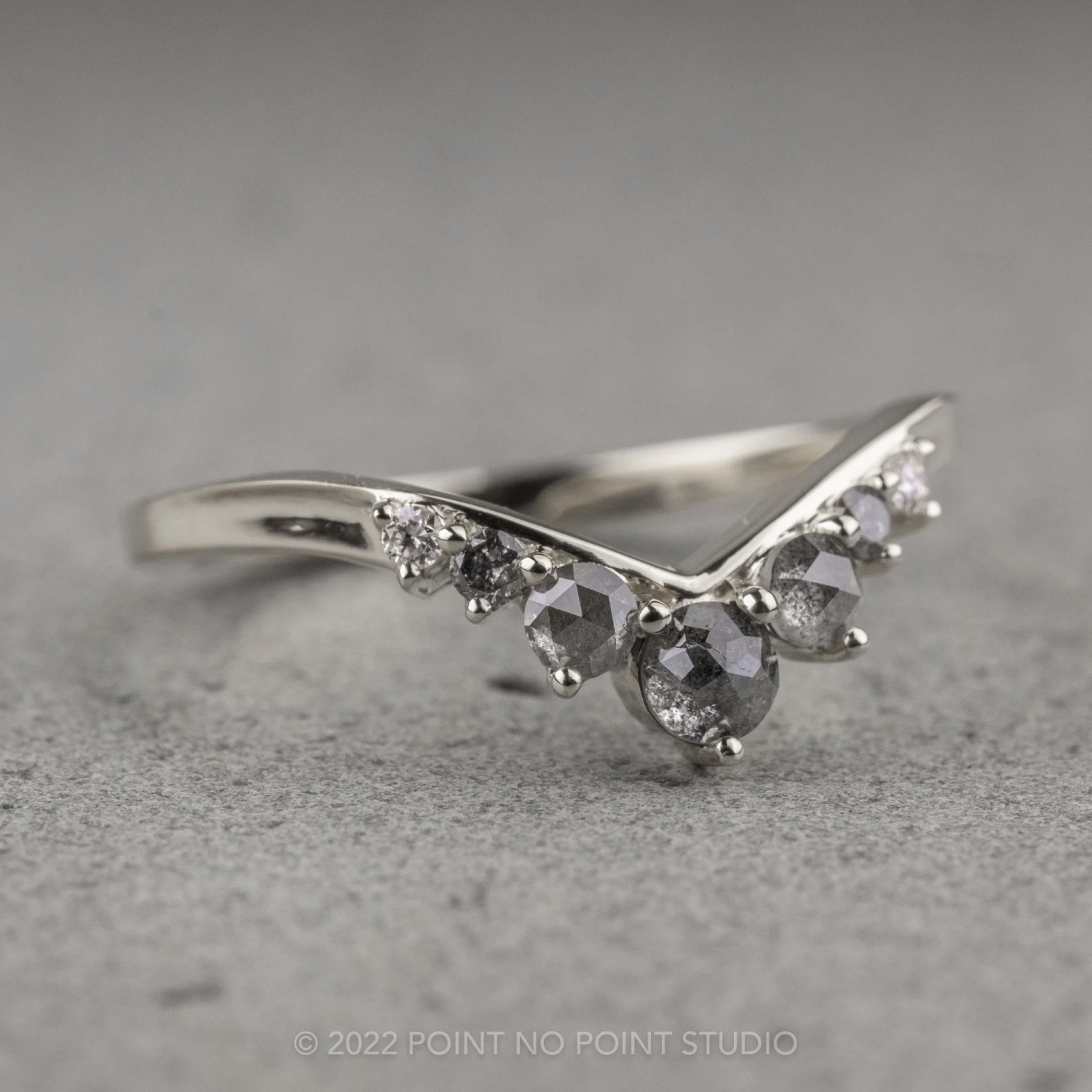 This timeless and unique wedding ring features a smooth gradient of striking light grey natural rose cut diamonds with salt and pepper and white brilliant cut diamonds. The ring features a soft diamond contoured curve, which will flatter many engagement ring styles.