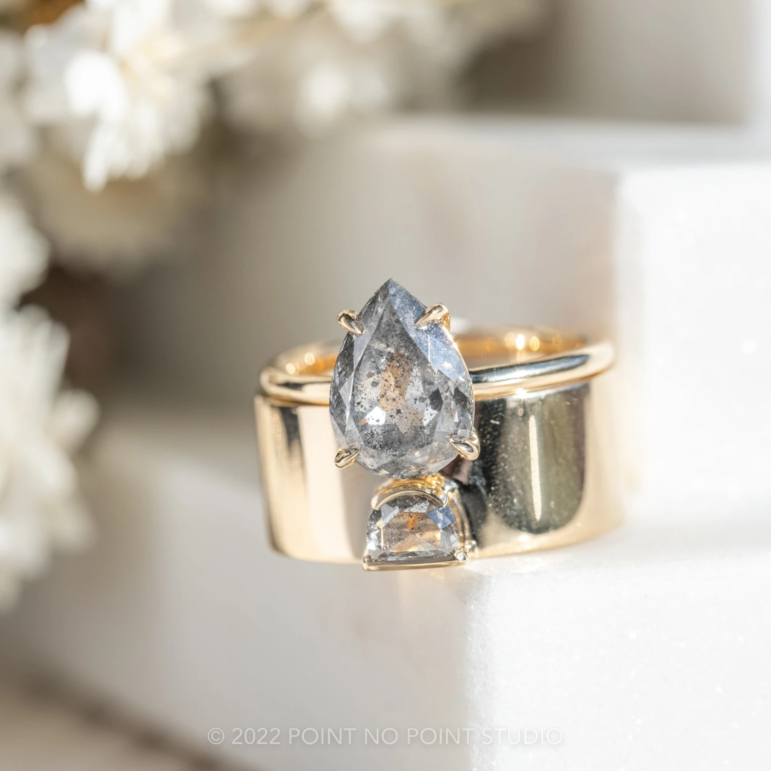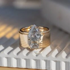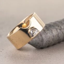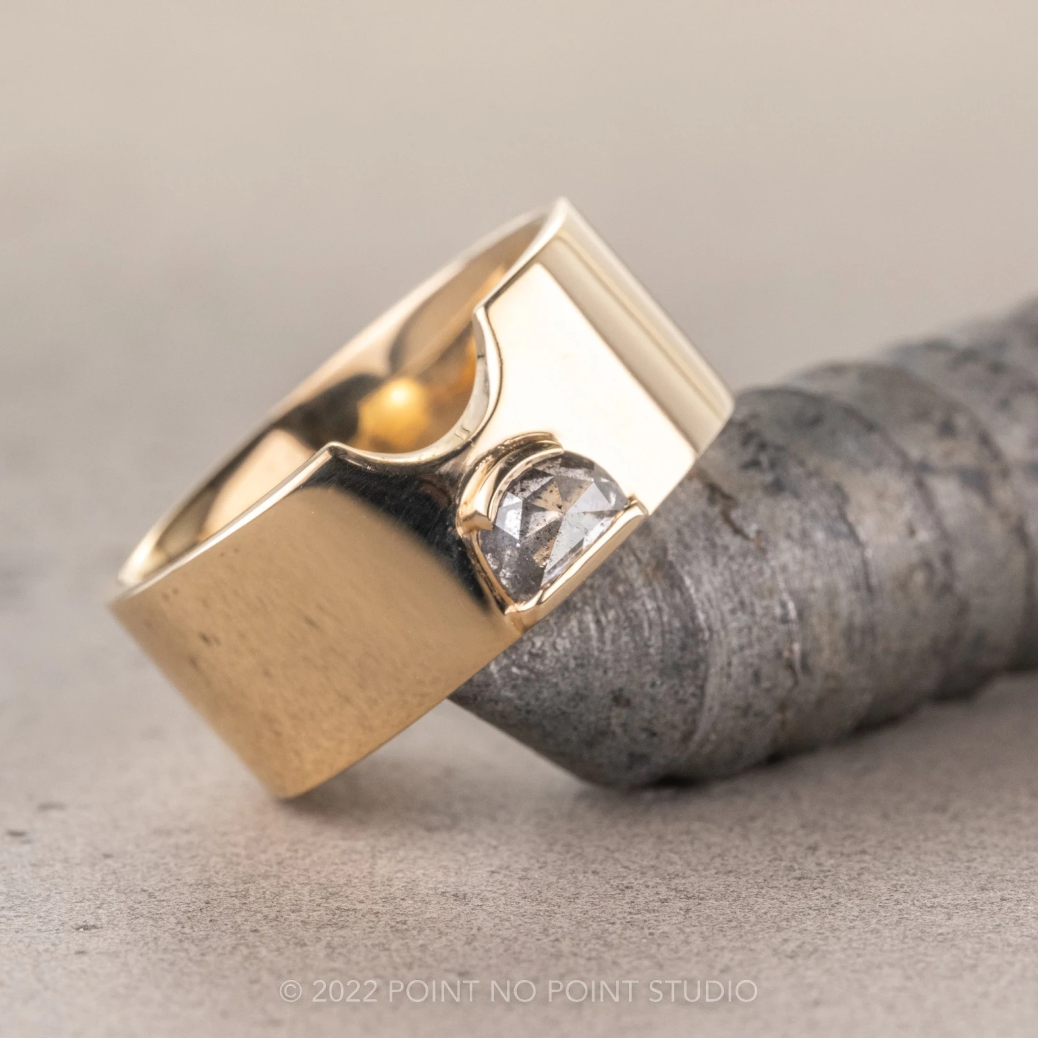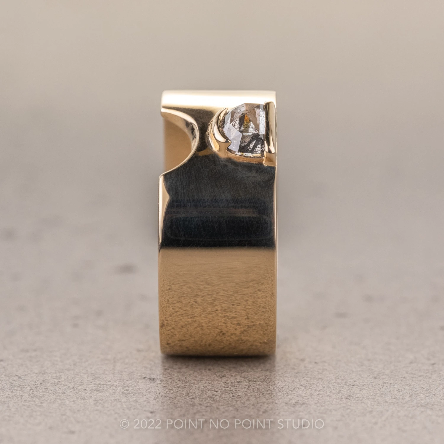 Adorned with a gorgeous half moon salt and pepper rose cut diamond that has been bezel set. This ring is made of solid recycled eco-friendly 14k yellow gold. The entire ring has a high polished finish. The ring is comfort fit which means that it is slightly domed making it an extremely comfortable ring to wear.