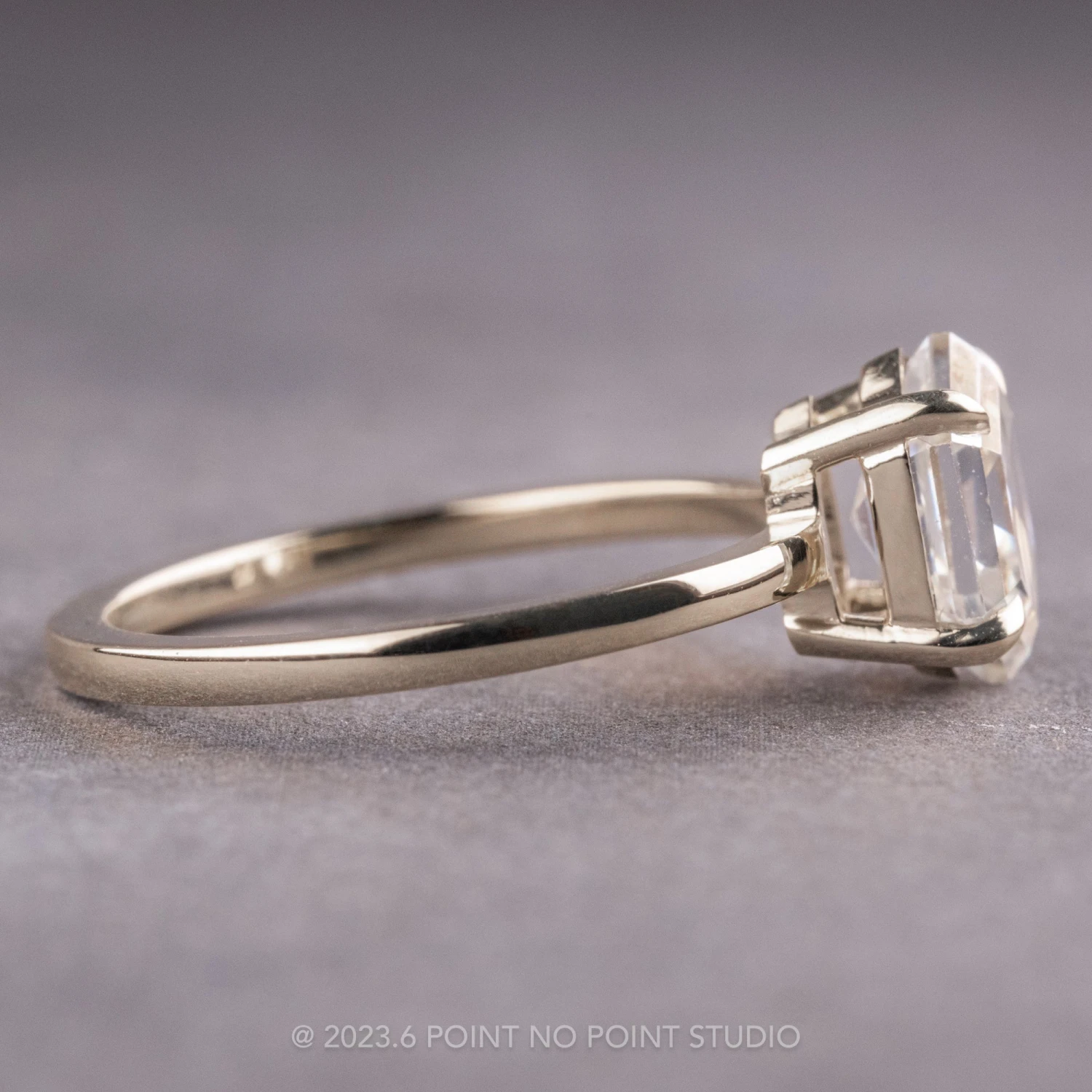 This timeless engagement ring features a stunning hexagon moissanite. The moissanite has been set in a raised profile 4 prong setting. The entire ring is made of recycled platinum.