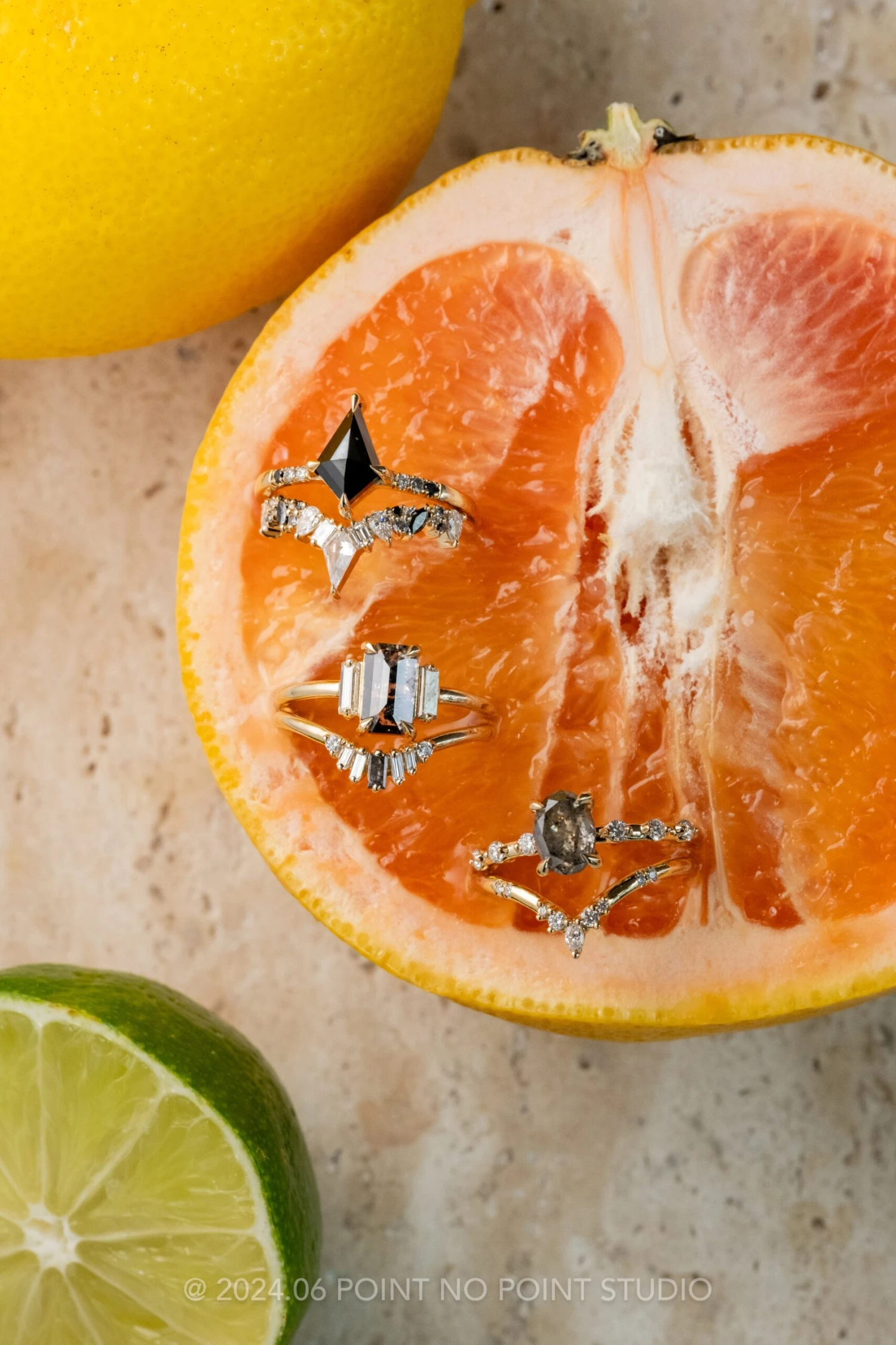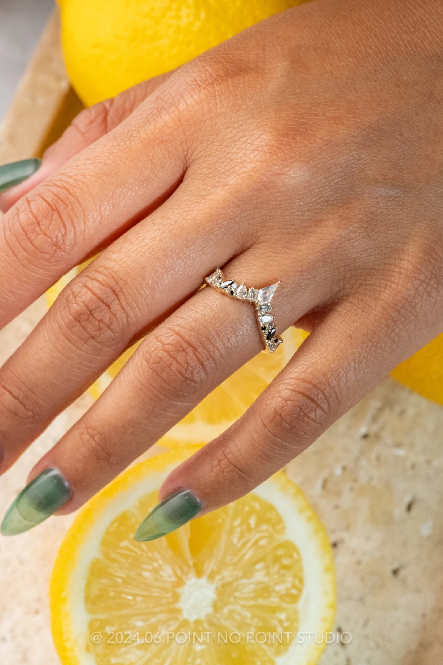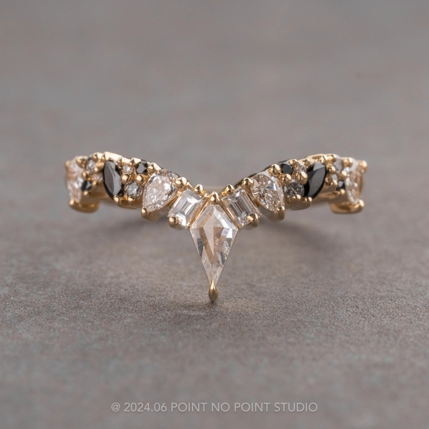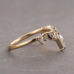 The unique ring features a standout design that will complement almost any engagement ring! The unique ring is a combination of two of our ethereal designs, and has a variety of different shapes making this truly an eye catching design. The entire ring is made of eco friendly 14K yellow gold.