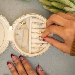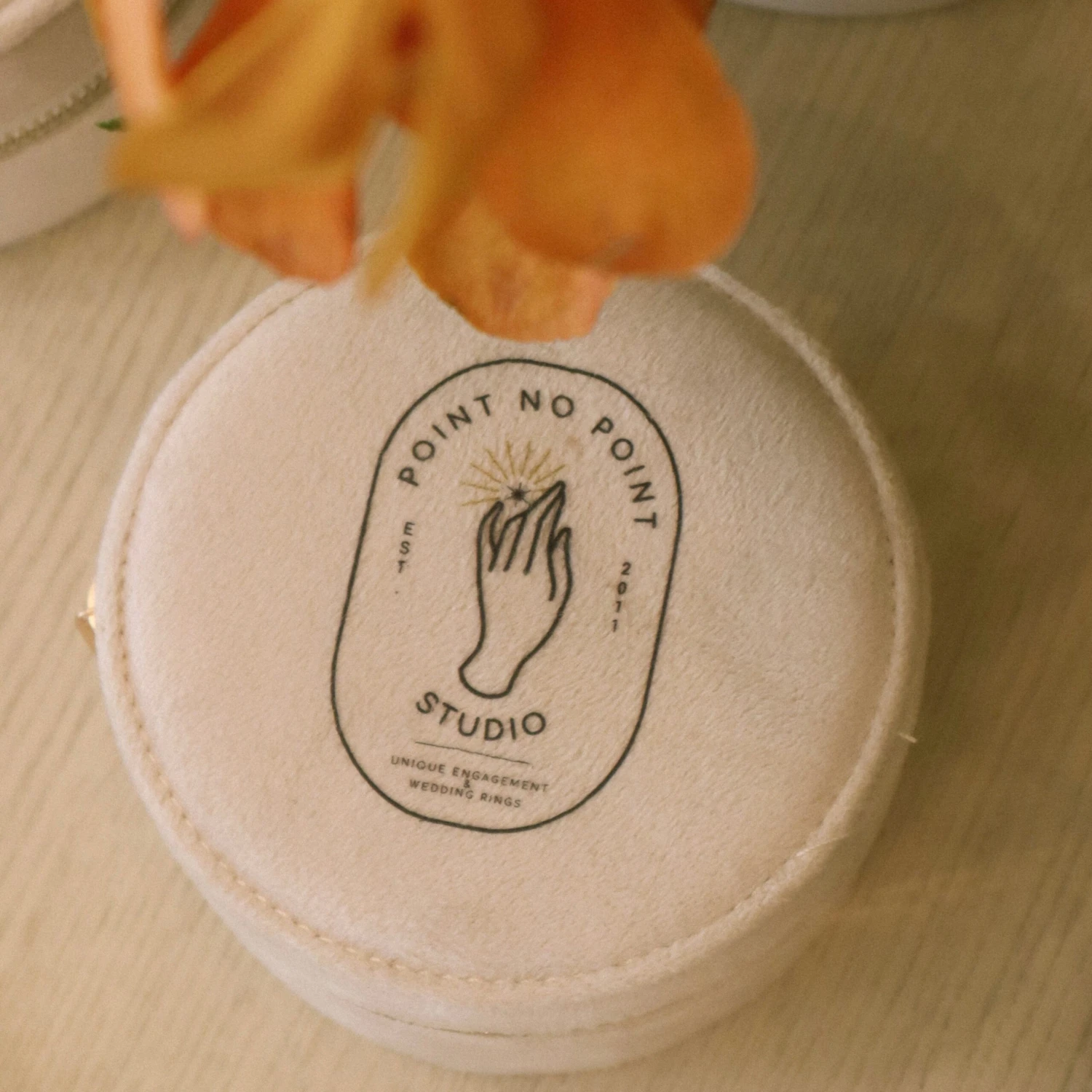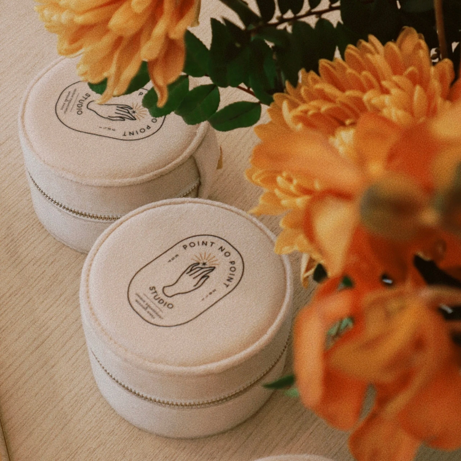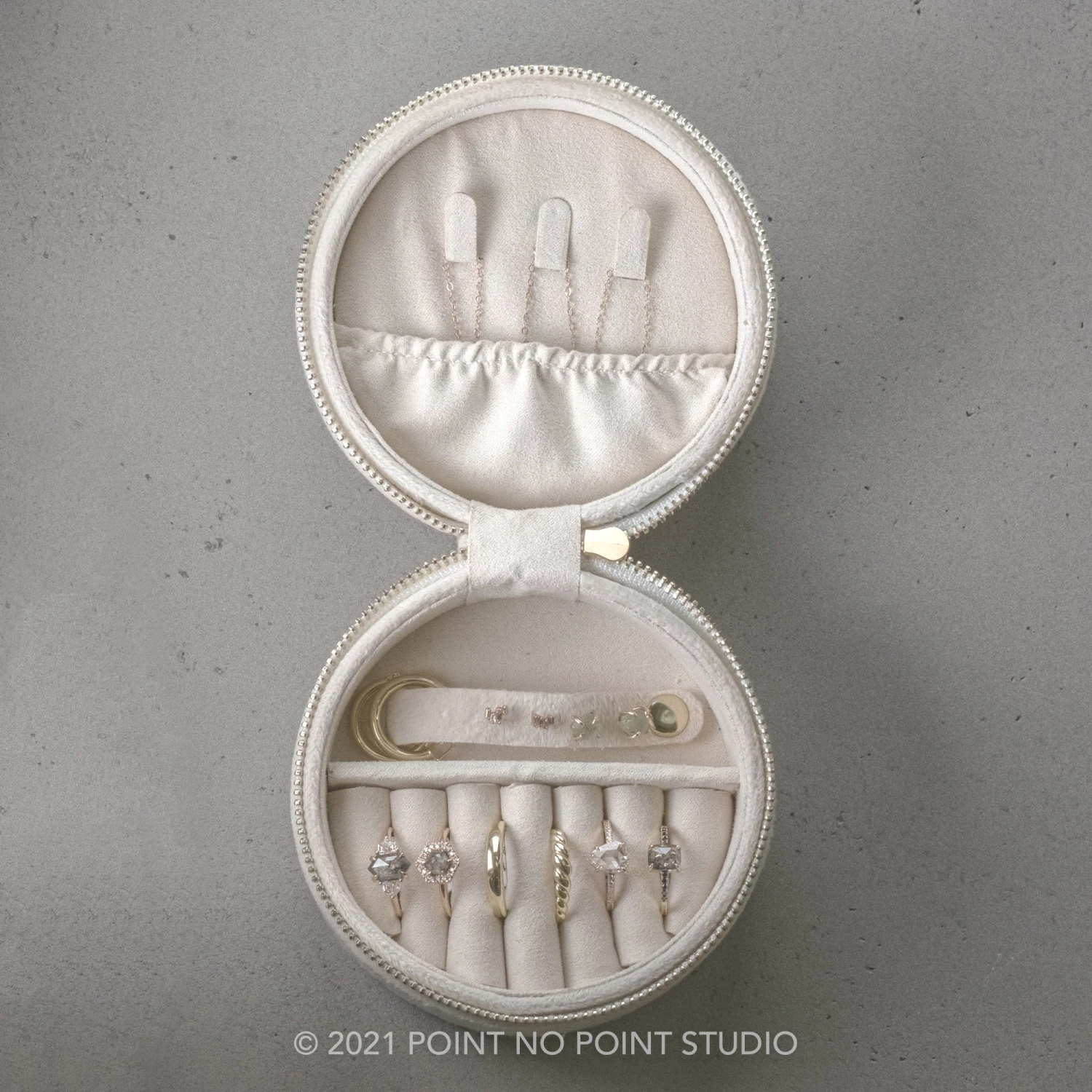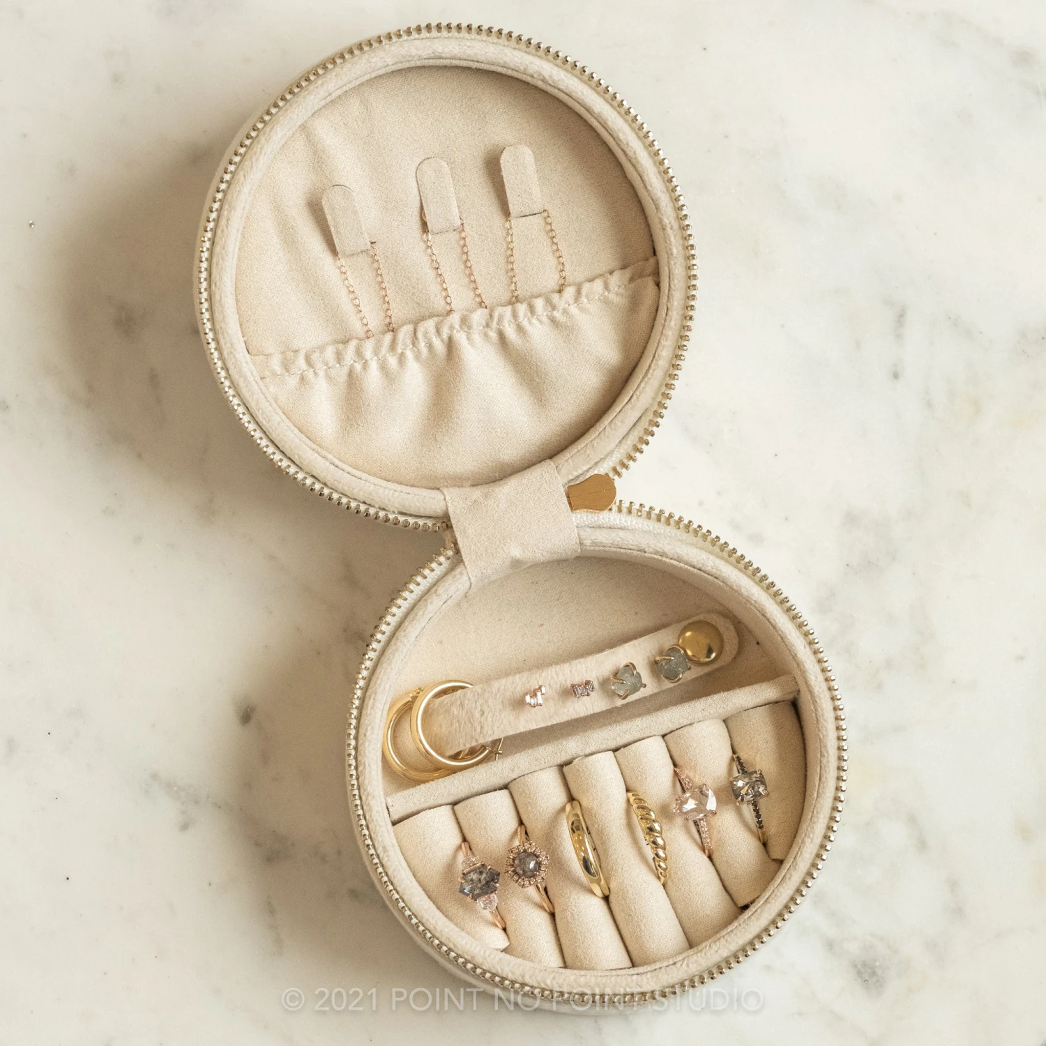 Made of creamy ivory velvet with a gold zipper, our branded travel case is perfect for storing all your most loved pieces on the go or at home!Â