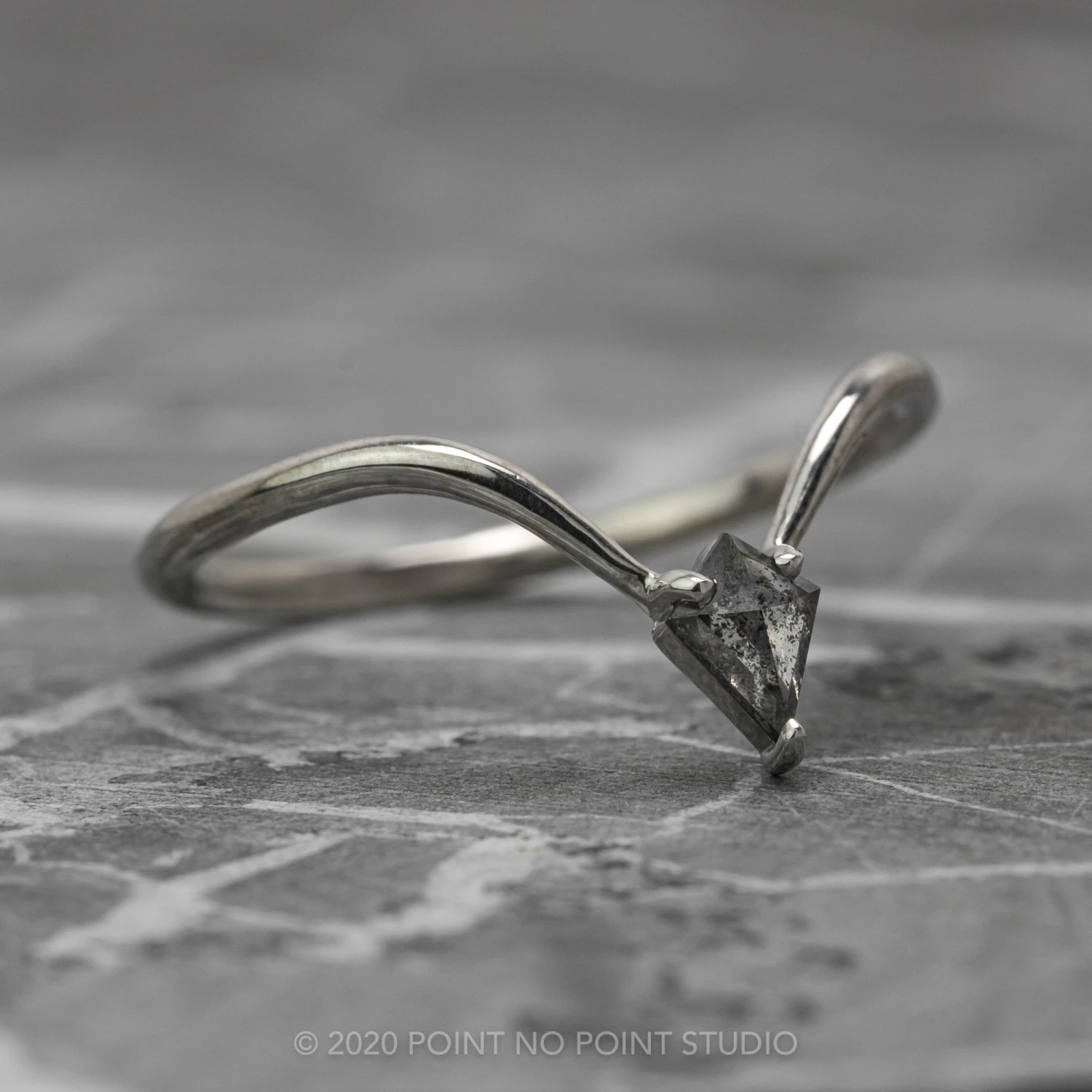 Enhance your engagement ring with the beautiful 14k white gold Victoria wedding band. At the tip of the V there is a salt and pepper kite diamond. This wedding band can be worn alone, stacked in multiples, or to match any number of engagement rings!