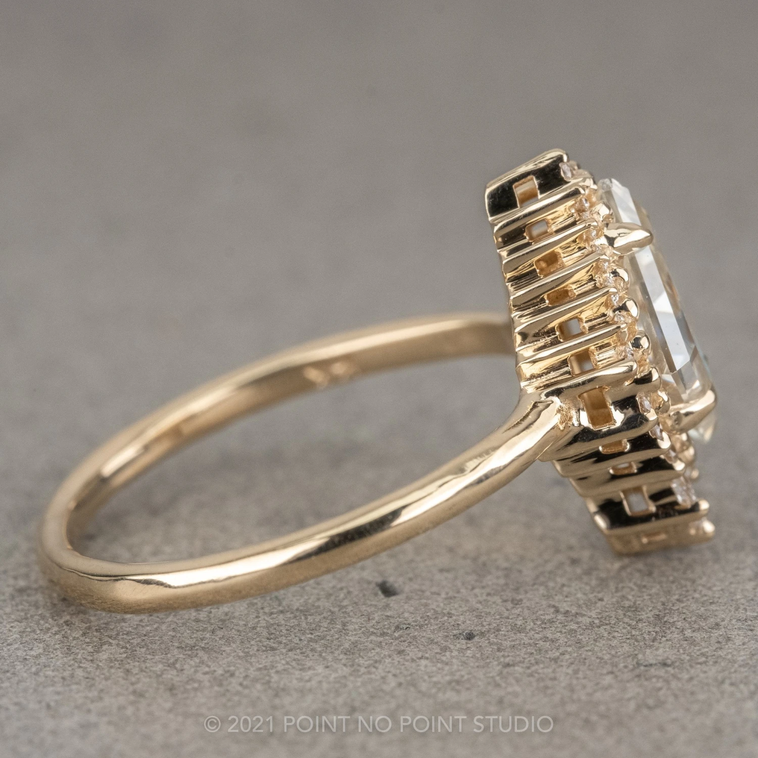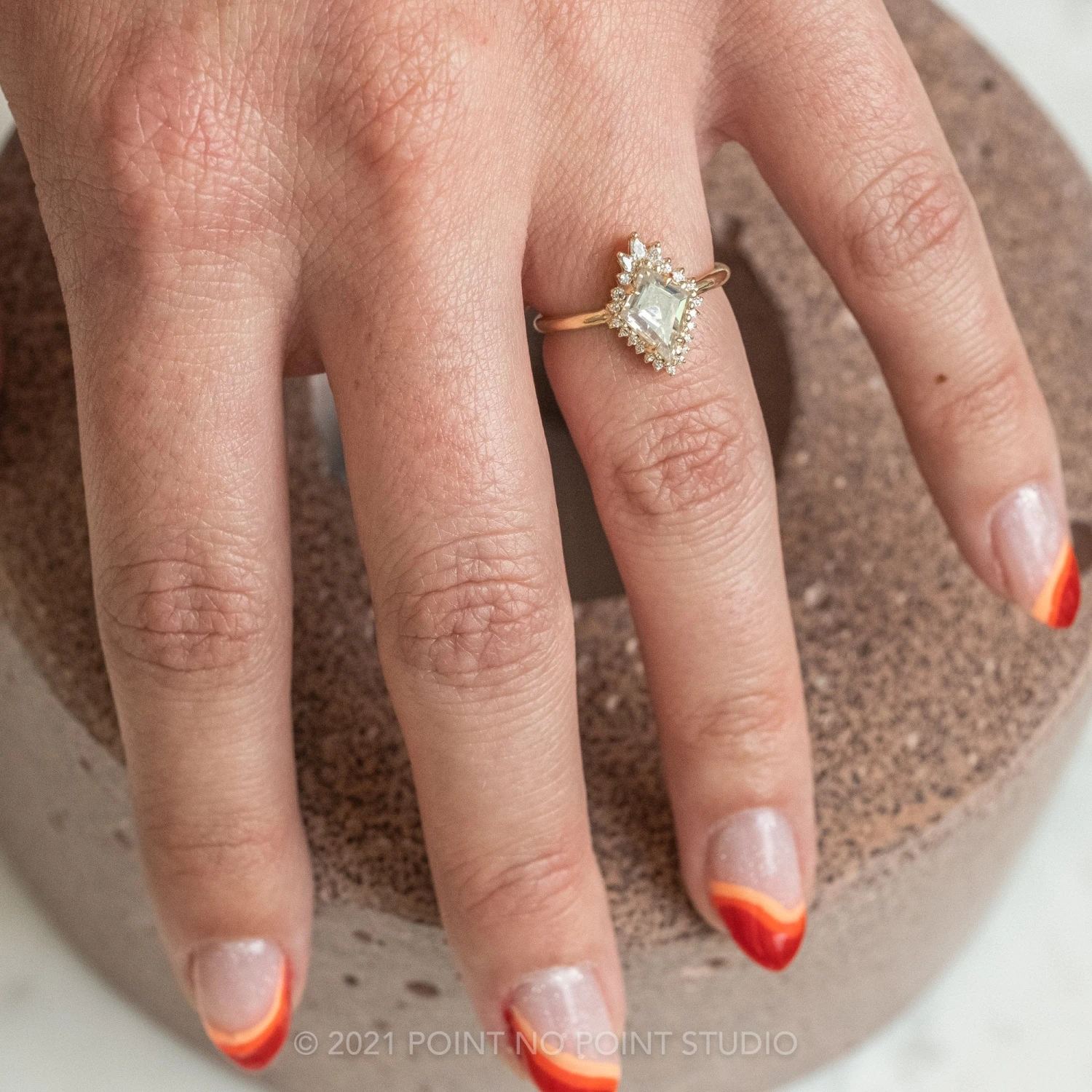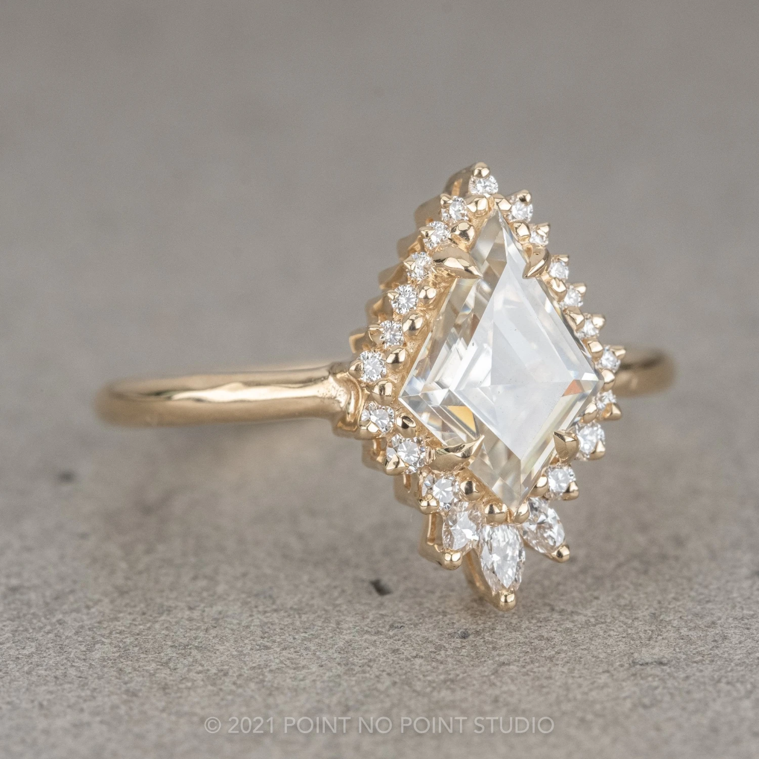 This ring features a beautiful kite moissanite, set in a vintage inspired halo setting. The halo features a unique combination of marquise and round shaped diamonds.