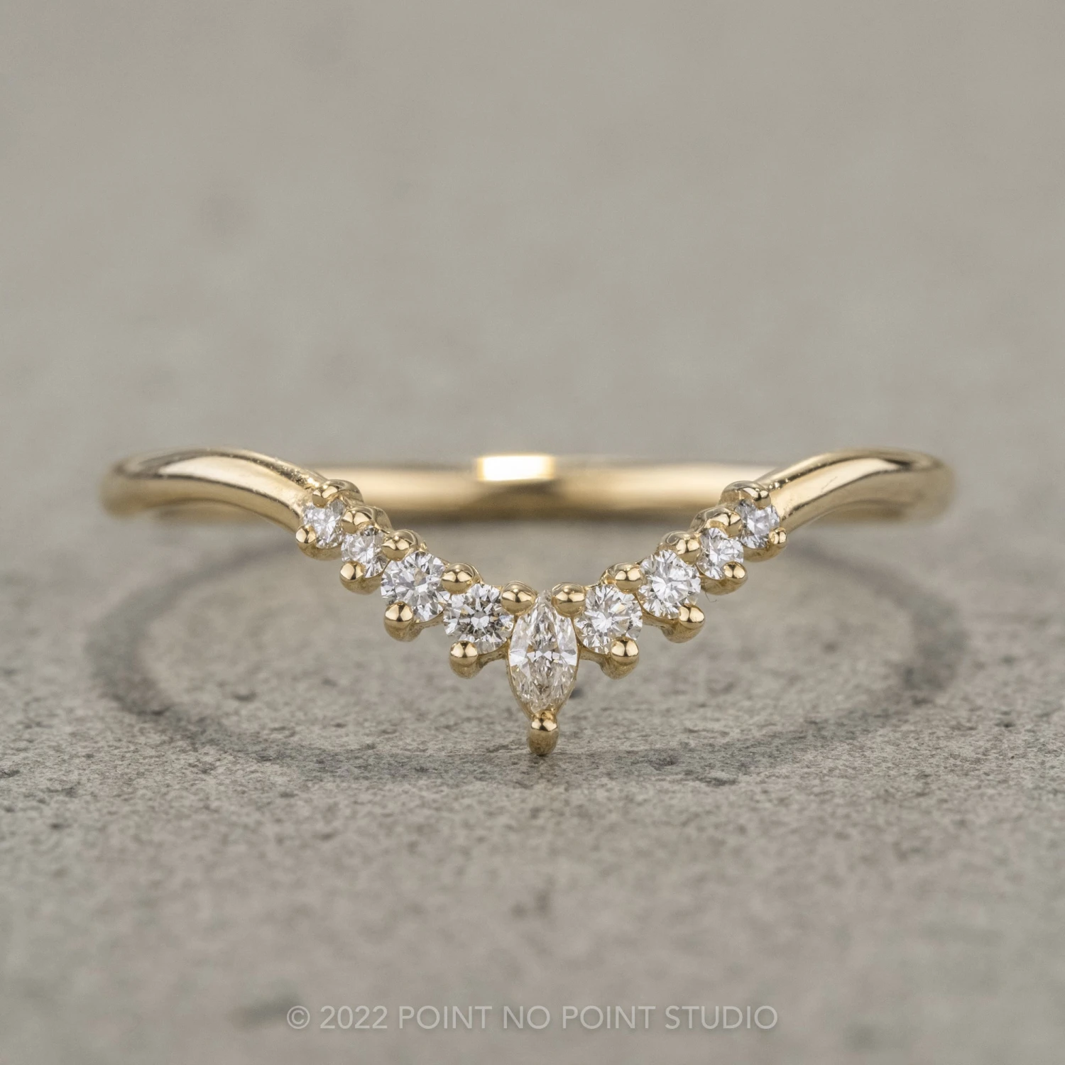 This unique ring features a gently sloping contoured row of white GHSI faceted brilliant cut diamonds – the focal point being the center marquise shaped diamond. The different diamond shapes create a truly unique profile and design that will set off just about any engagement ring.Â