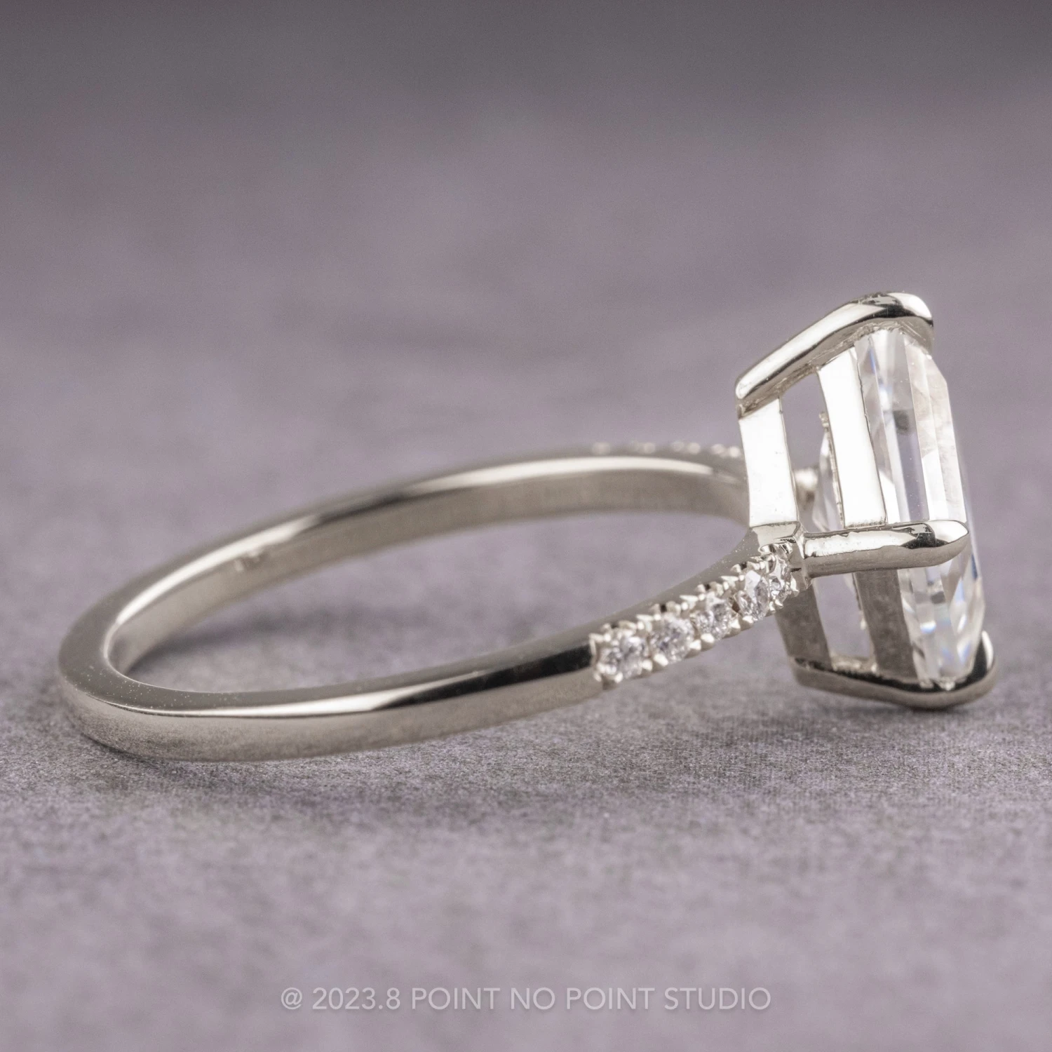 This timeless engagement ring features a stunning lozenge shaped moissanite. The moissanite has been set in a raised 4 prong setting with sparkly white diamonds in the band. The entire ring is made of platinum.Â