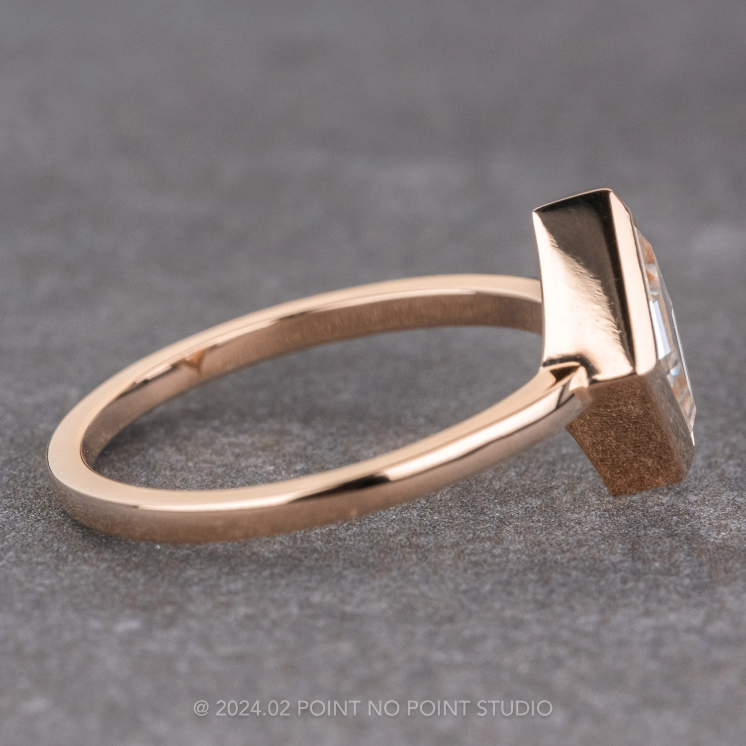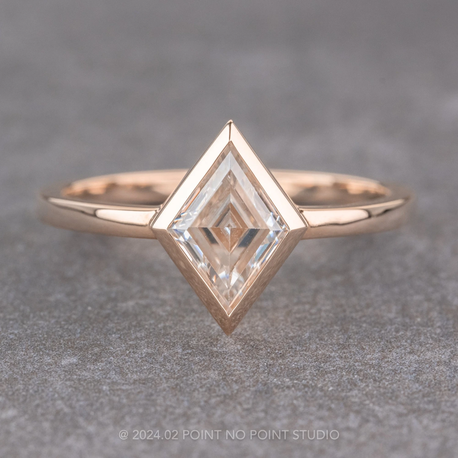 The lozenge is set into an encompassing bezel setting that sits directly on the finger. The ring band measures 1.7mm wide and is extremely comfortable to wear. This entire ring is made of recycled 14k rose gold.Â