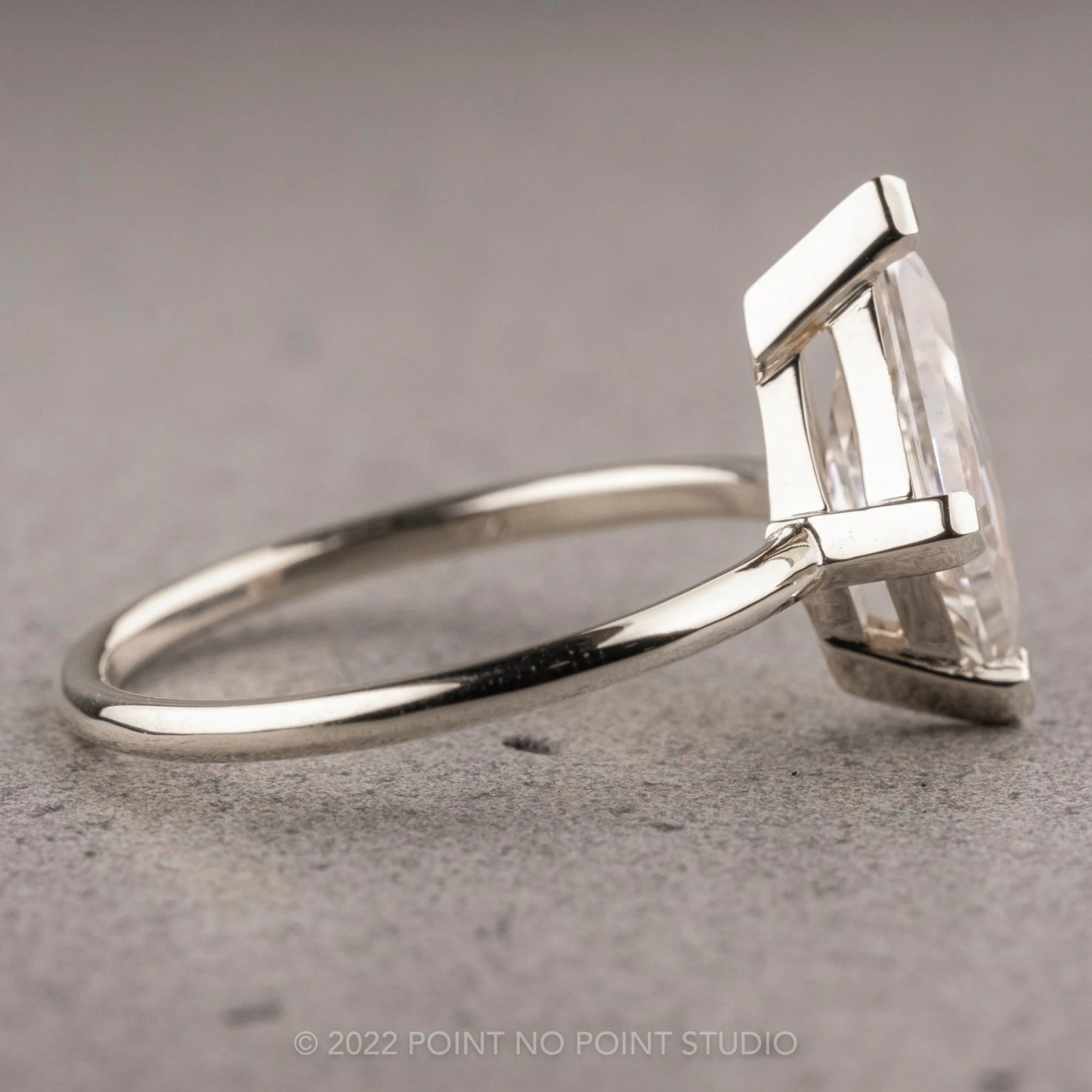 This timeless engagement ring features a stunning lozenge moissanite. The moissanite has been set in a low profile prong setting with 4 chevron tips on each corner of the moissanite. The entire ring is made of platinum.Â
