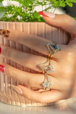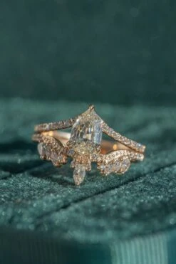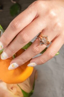 The entire ring is made of eco-friendly recycled 14k peach gold; the settings for the stones were made to be low profile and comfortable for everyday wear.Â
