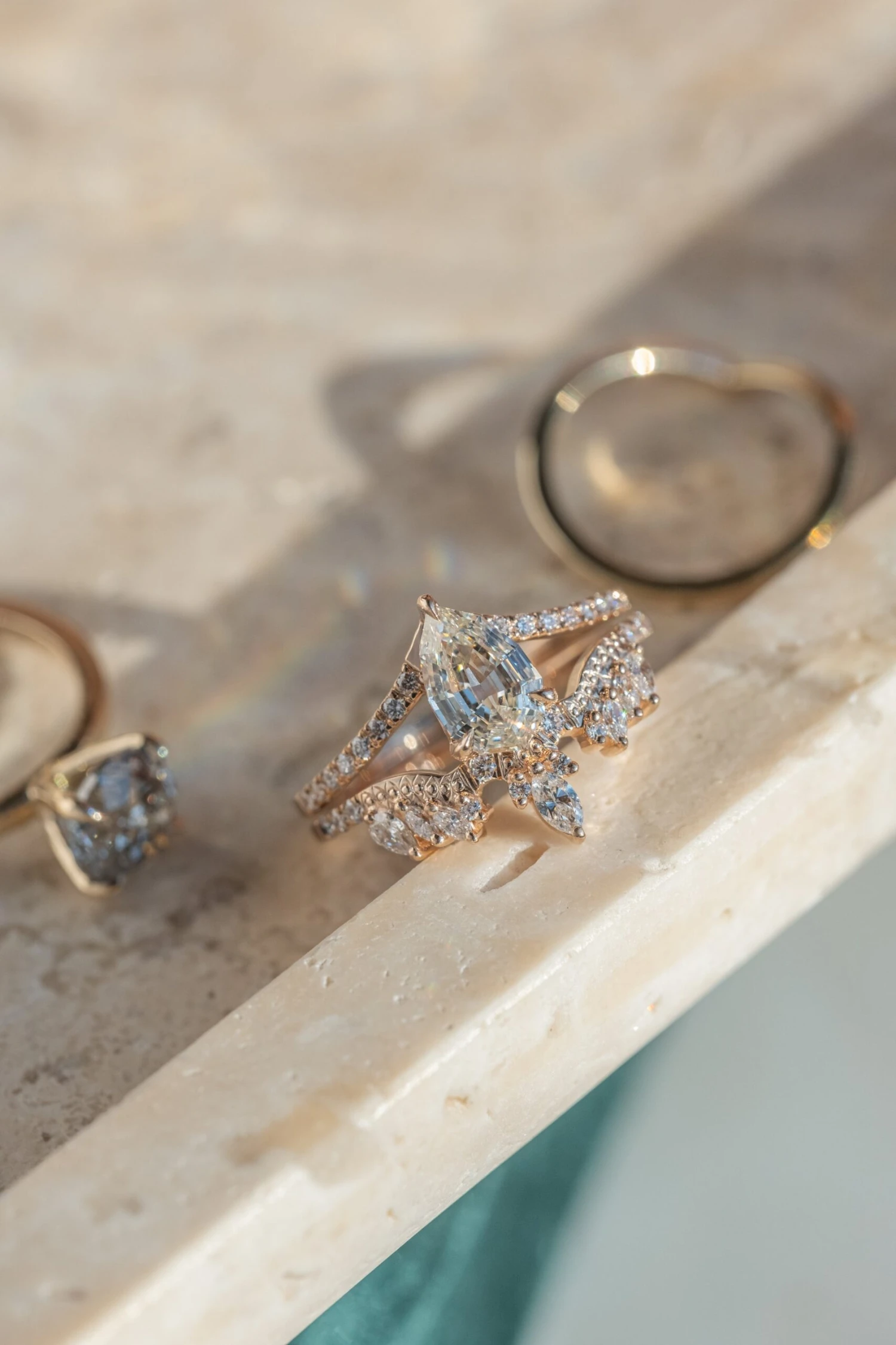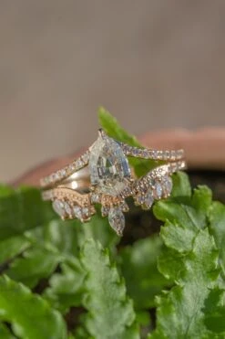 This unique wedding ring features natural sparkly GHSI faceted white diamonds in various shapes with a stunning marquise shaped diamond as the focal point. This band can be worn alone, stacked in multiples or to match any number of Point No Point Studio engagement rings!