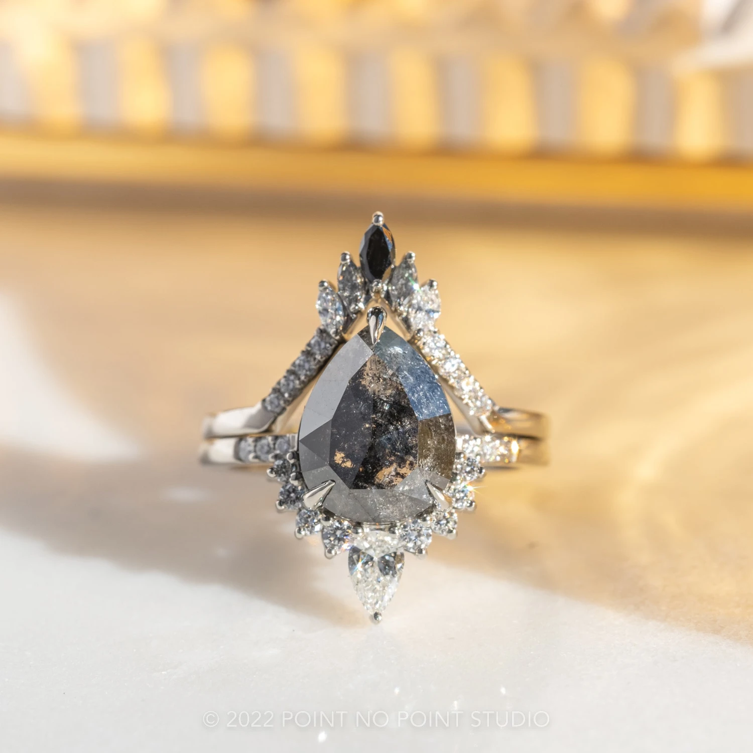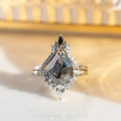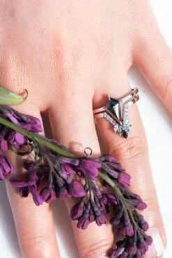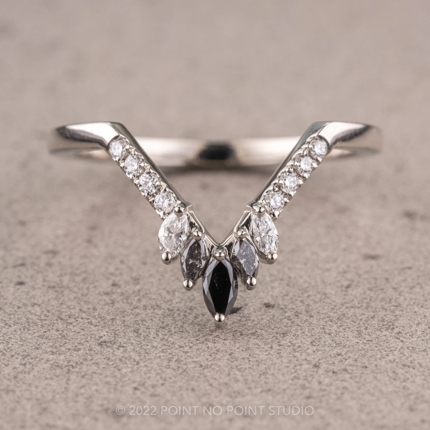This timeless and unique wedding ring features black, grey and white diamonds with a v-shape that will complement many different engagement ring styles!Â