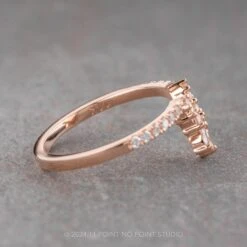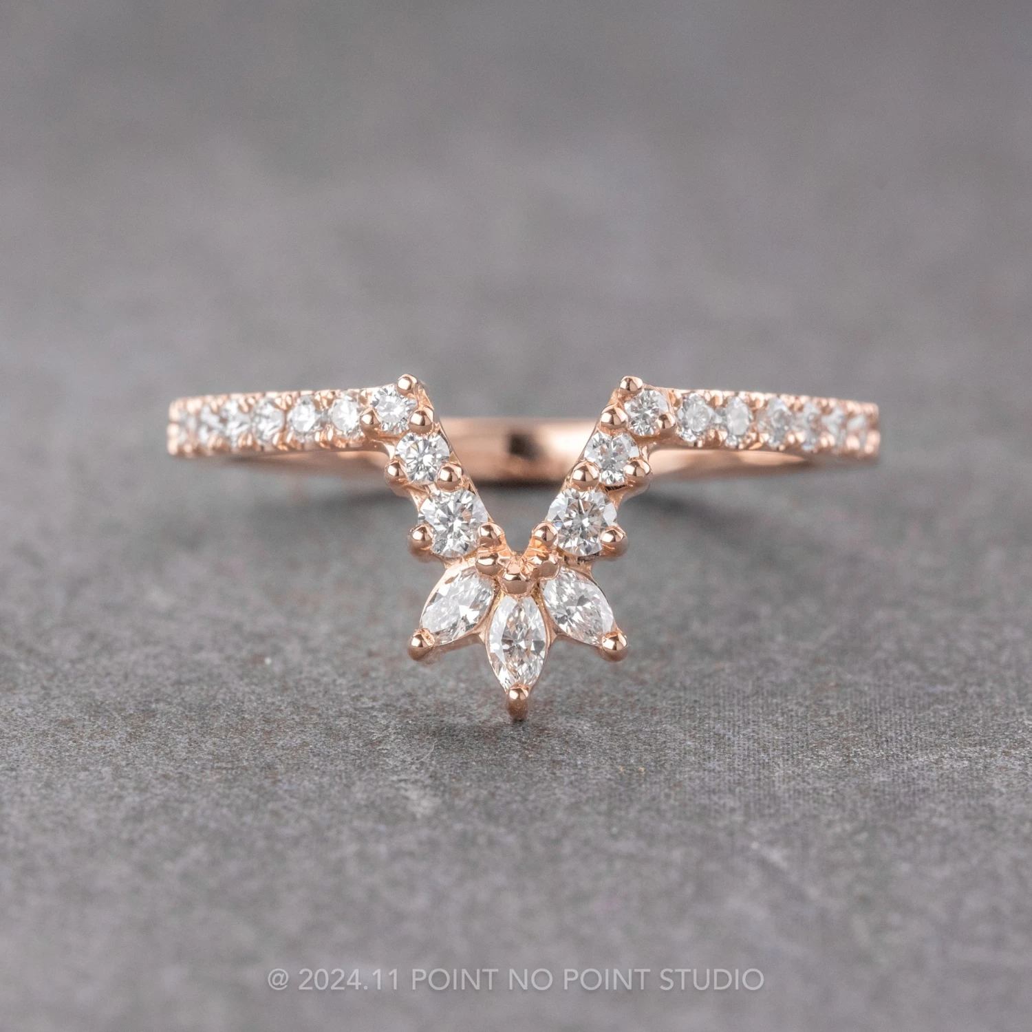 This timeless and unique wedding ring features sparkly GHSI white round diamonds and 3 marquise diamonds creating a v-shape that will complement many different engagement ring styles!