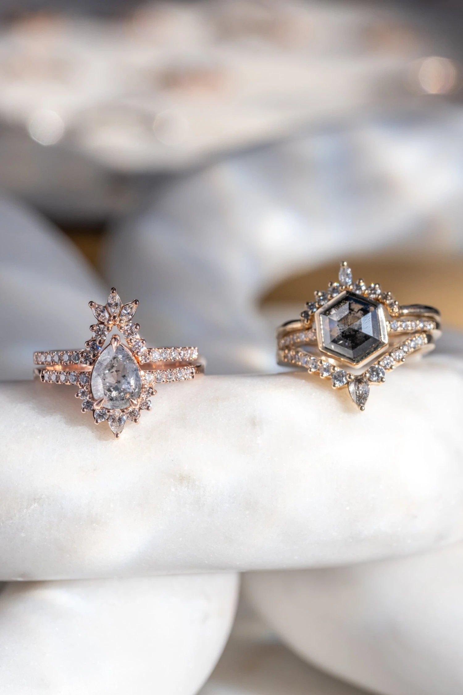 The entire ring is made of recycled 14k rose gold; the settings for the stones were made to be low profile and comfortable for everyday wear.