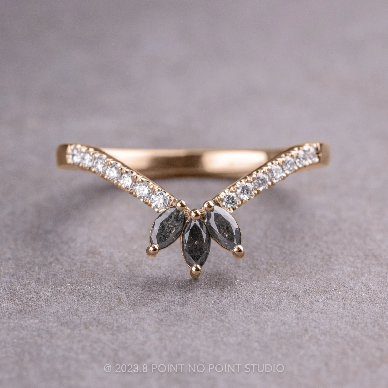 This timeless and unique wedding ring features salt and pepper and white diamonds with a v-shape that will complement many different engagement ring styles!