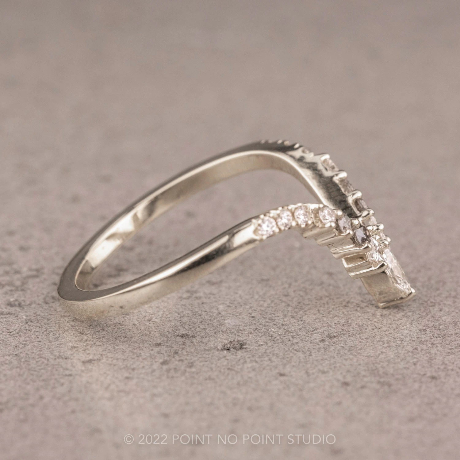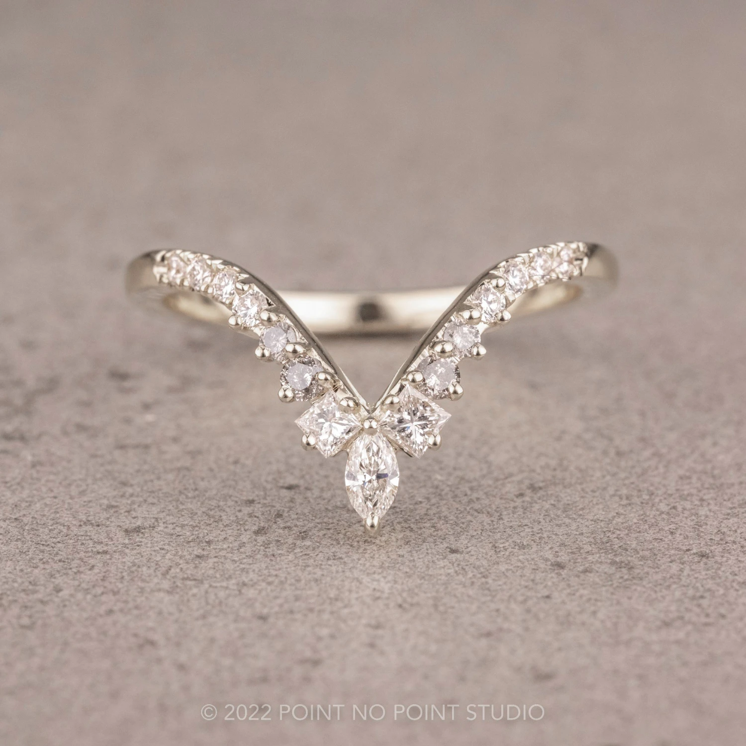 This timeless and unique wedding band features grey and white diamonds in various shapes with a stunning marquise diamond as the focal point. This ring has a v-shape that will complement many different engagement ring styles!