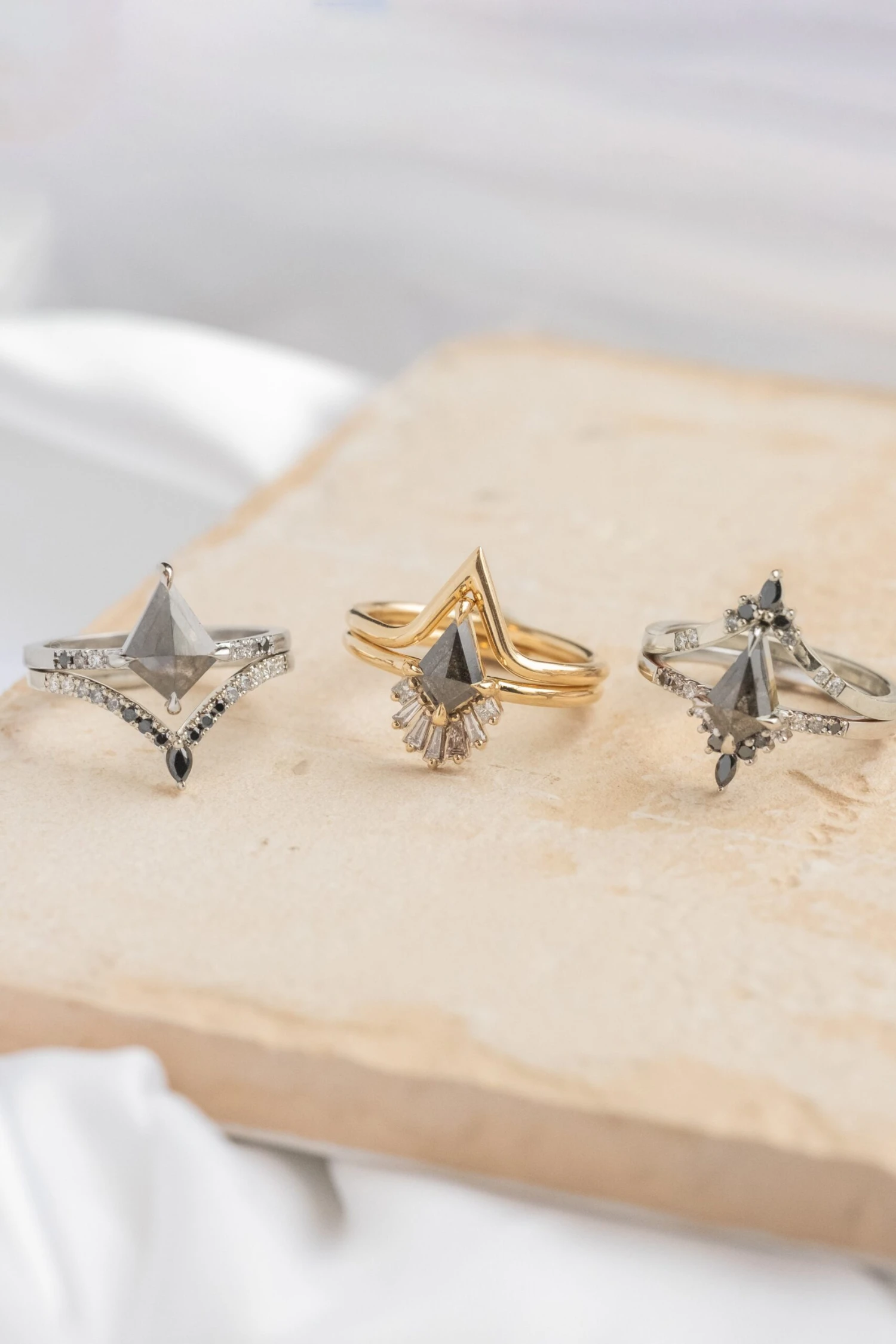 This stunning wedding ring features a v-contour of black, grey and GHSI white diamonds that gradient in color, with a striking black marquise diamond at the tip. This band can be worn alone, stacked in multiples or to match any number of engagement rings!